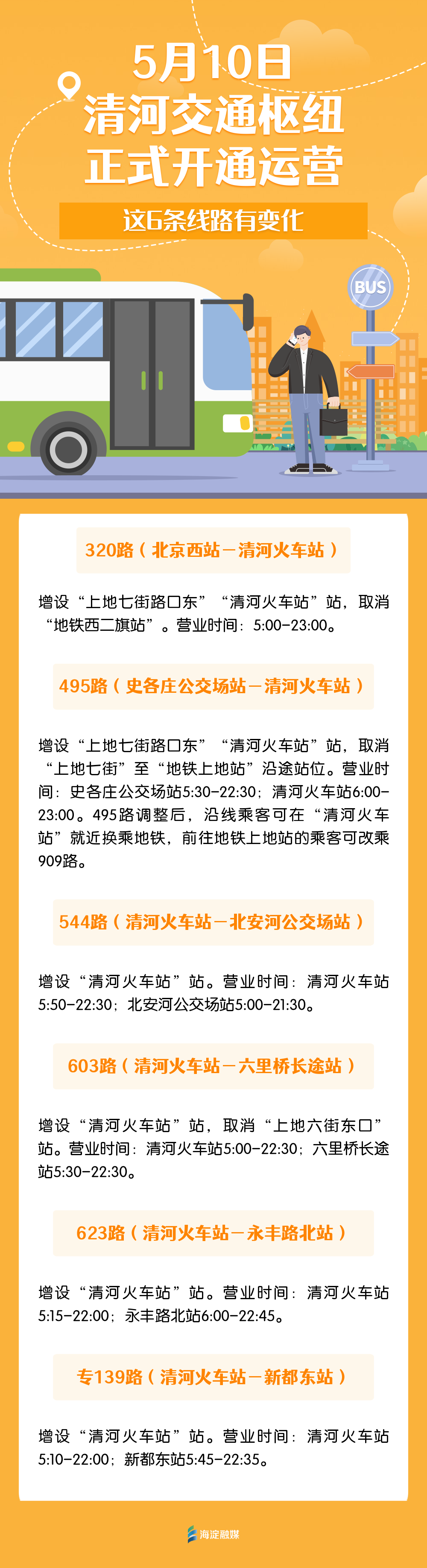 今天(5月10日)首班车起,清河交通枢纽正式开通运营首批6条入驻公交线,行车线路有变化!