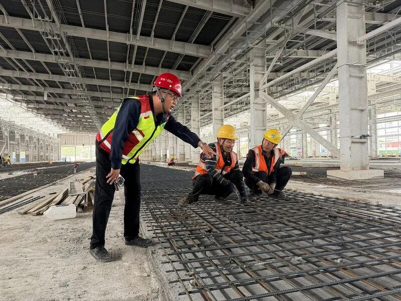 【刘兵:我们这个项目总建筑面积是52450平方米,包括运用库、综合楼、洗车库等一系列配套设施。目前,综合楼跟运用库的主体结构已经全部封顶。双节期间劳务人员流动性增加,项目部也加强了沟通和交流,了解工人们的需求和困难,并及时给予帮助,提高作业人员的福利待遇。现场设备维护方面,确定了专业的人员进行维护保养,及时排除故障。】