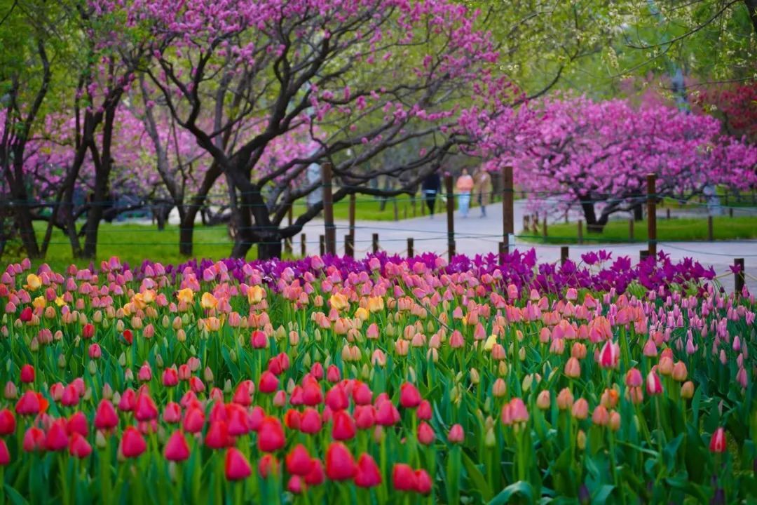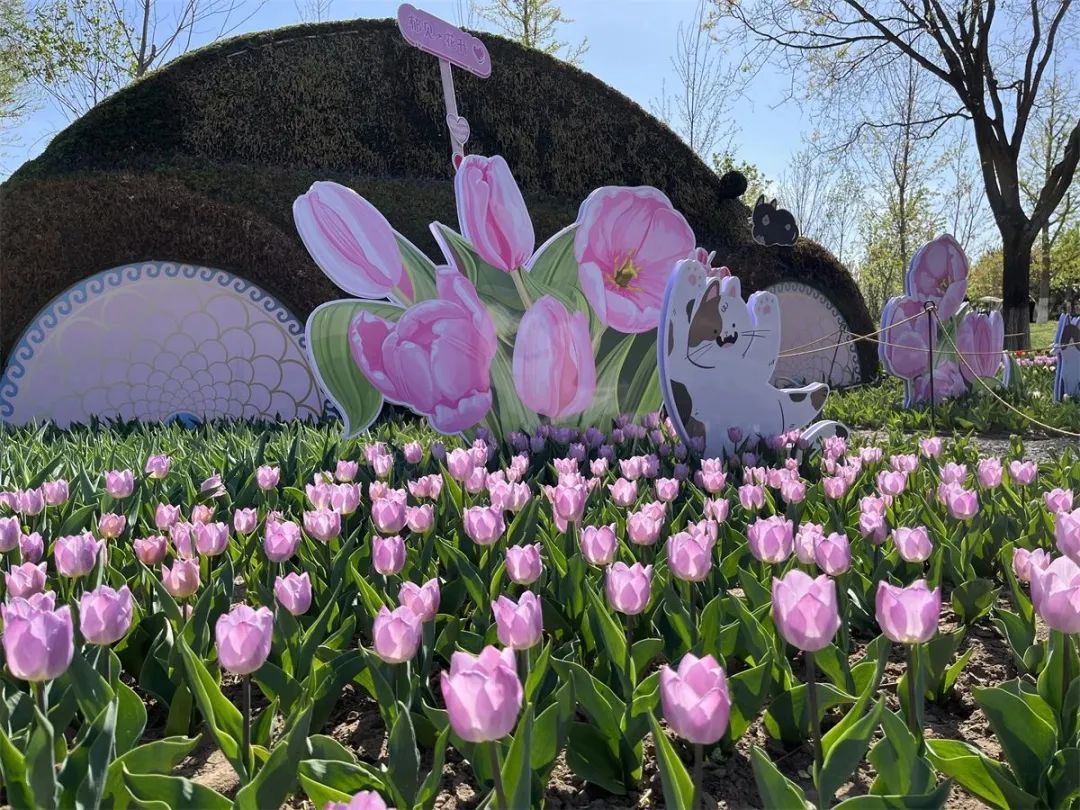 多彩的郁金香将整个展区分割成不同的色块、色带,各色鲜花随地势起伏,与周边的桃花、海棠交相辉映,营造出不同的景观效果,配上蓝天白云、远山绿树,犹如一幅优美的生态画卷。