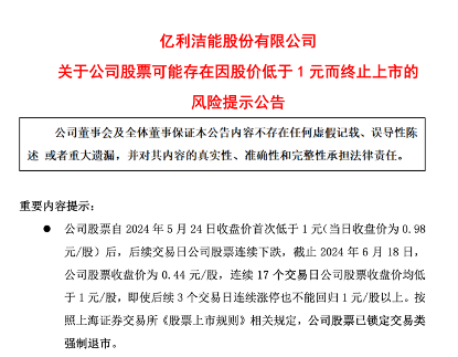 6月18日,ST亿利公告,截止2024年6月18日,公司股票收盘价为0.44元/股,连续17个交易日公司股票收盘价均低于1元/股,即使后续3个交易日连续涨停也不能回归1元/股以上。按照上海证券交易所《股票上市规则》相关规定,公司股票已锁定交易类强制退市。