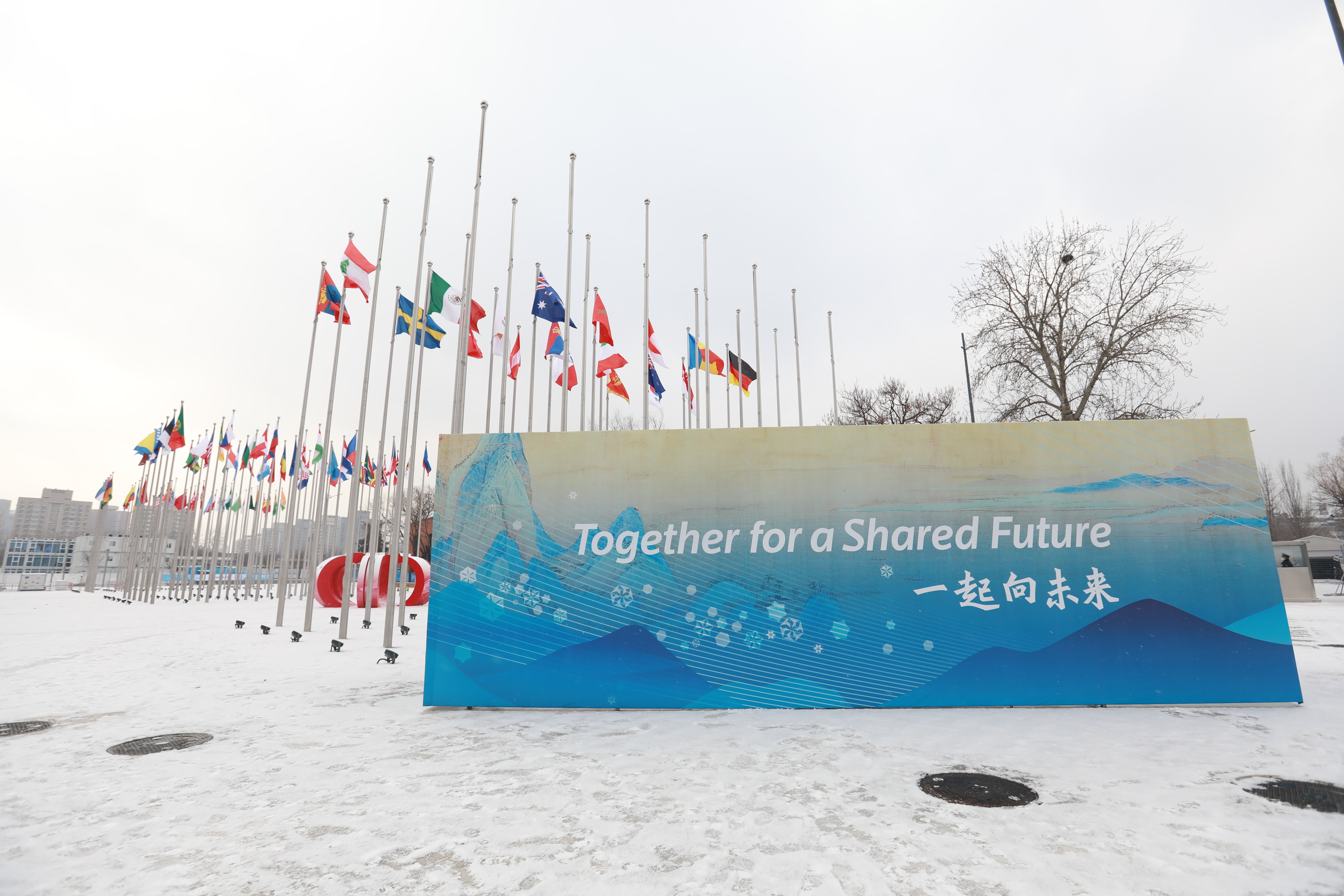 旗帜广场上,各国的国旗在纷飞的雪花中迎风飘扬。