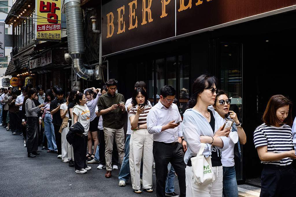 △当地时间2025年5月30日,韩国首尔,人们在投票站前排起长队,进行总统选举的提前投票。视觉中国 图