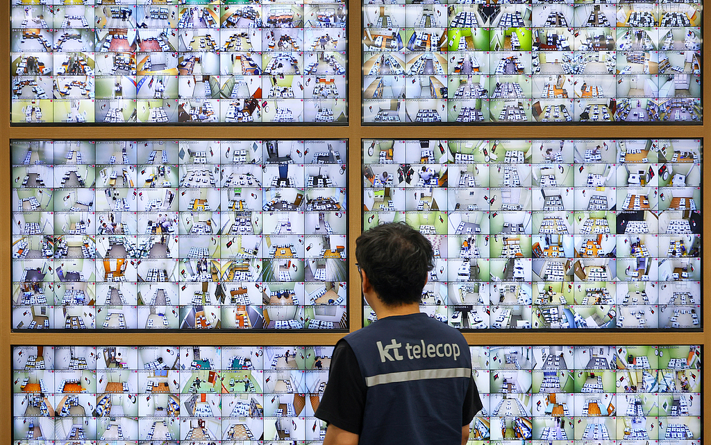 △当地时间2025年5月30日,韩国京畿道果川市中央选举管理委员会选举综合情况室,一名工作人员正在检查境内提前投票箱的存放地点监控视频。视觉中国 图
