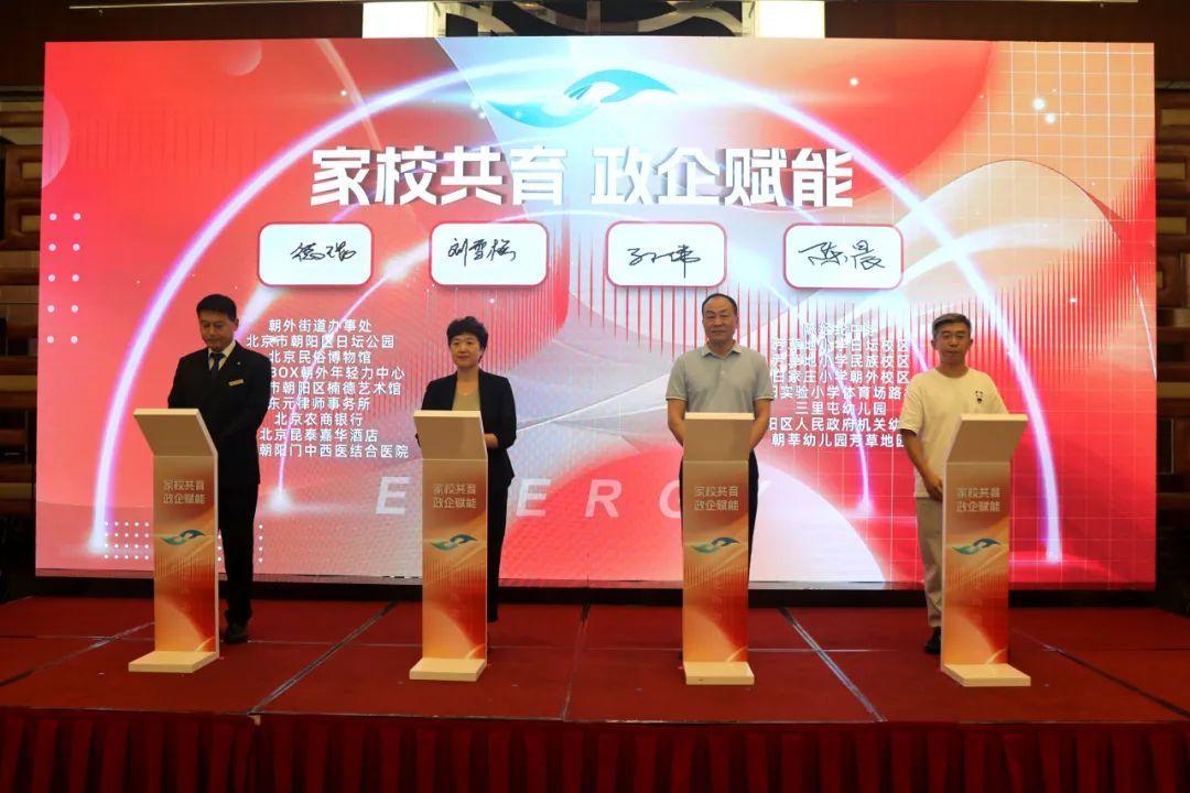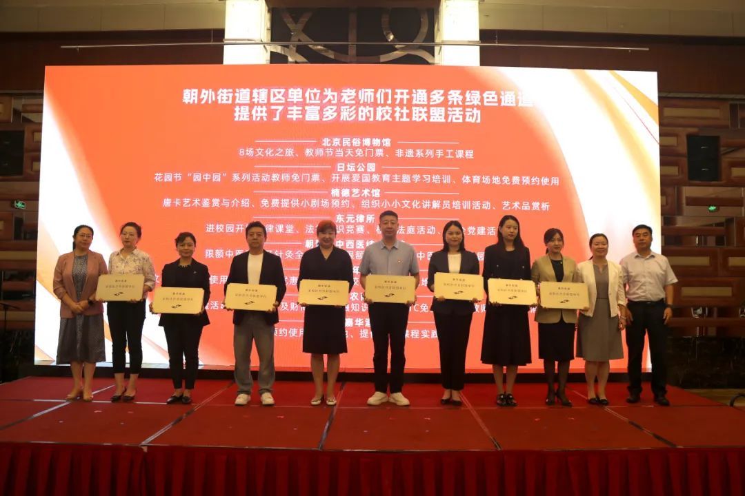 朝阳区文旅局二级调研员牛宇闳、区教委领导、朝外街道办事处主任黄海燕为家校社联盟的8家联盟单位代表颁发“共建共育联盟单位”牌匾,联盟单位代表与学校代表陆续作表态发言。