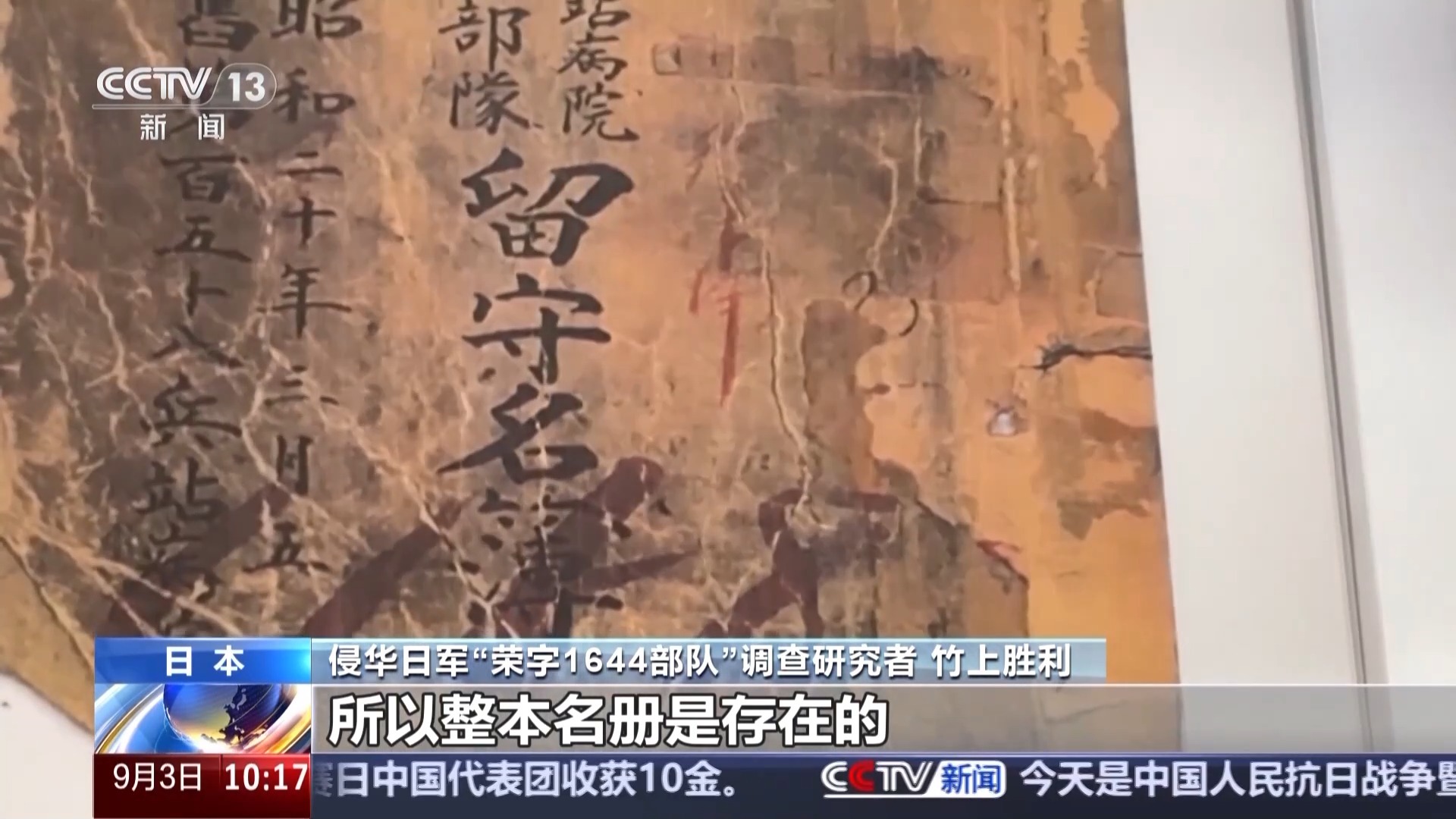 侵华日军“荣字1644部队”调查研究者 竹上胜利:“荣字1644部队”的留守名册是有的,但现在尚未公开,我只能拿到关于我父亲的那部分,所以整本名册是存在的。但是政府的人说要保护隐私,我可以申请把我父亲的那部分给我,但是我最关心的那份不给我。