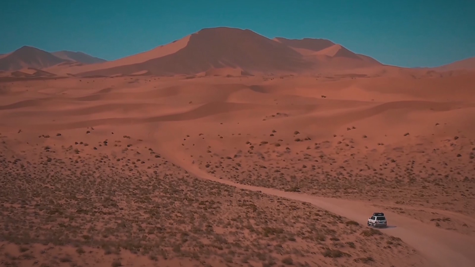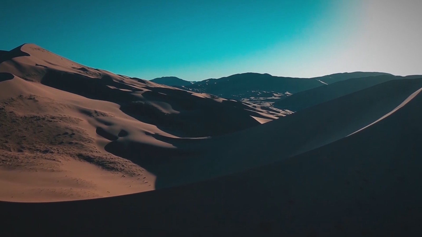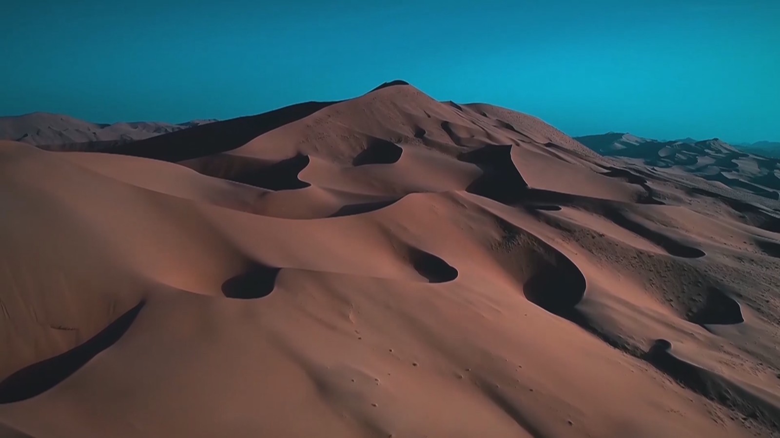 航拍镜头下,巴丹吉林沙漠雄浑壮阔,有独特、稀有、绝妙的高大沙山,以及无数色彩斑斓的丘间湖泊。