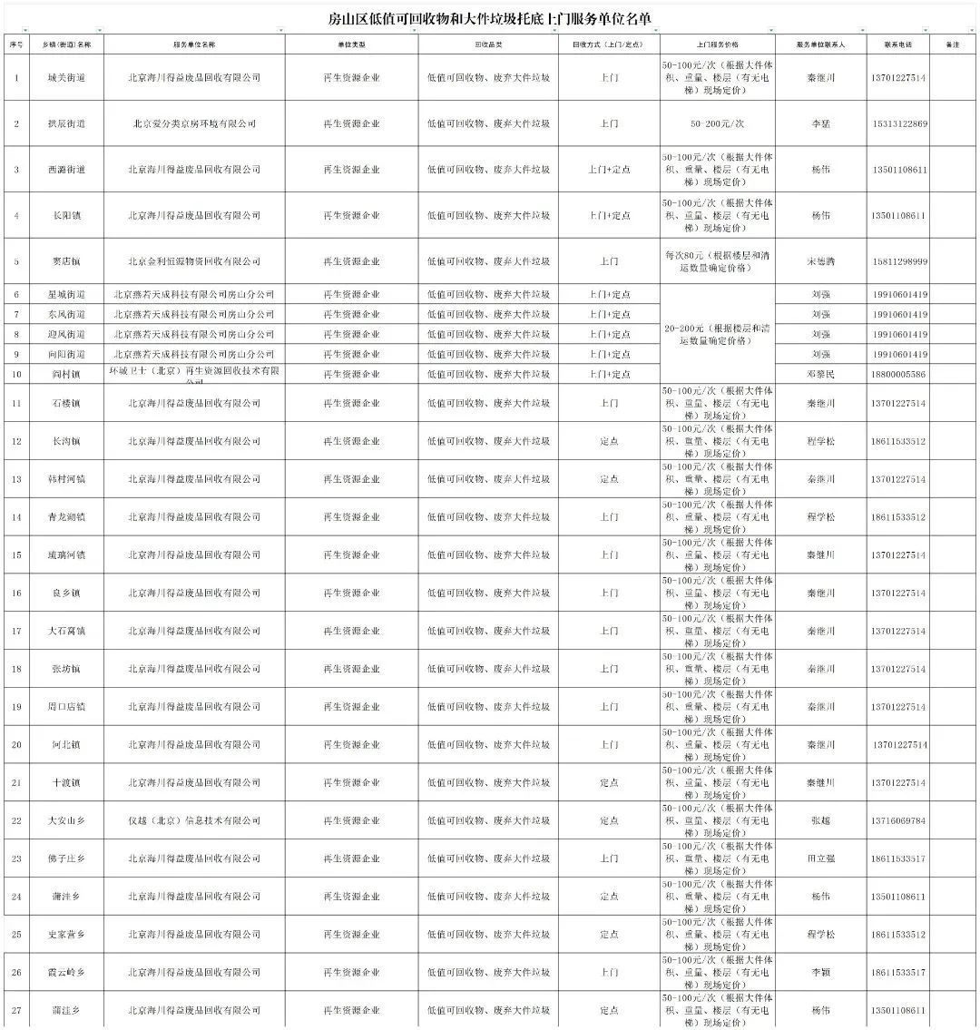 为落实《关于进一步加强生活垃圾分类工作的若干措施》(市垃圾分类指办〔2024〕64号)和《关于加强本市大件垃圾管理的指导意见》(市垃圾分类指办〔2021〕57号),便利市民,房山区城市管理委指导各乡镇(街道)明确本辖区提供大件垃圾托底上门回收服务单位,推行居民大件垃圾托底上门回收服务全覆盖。