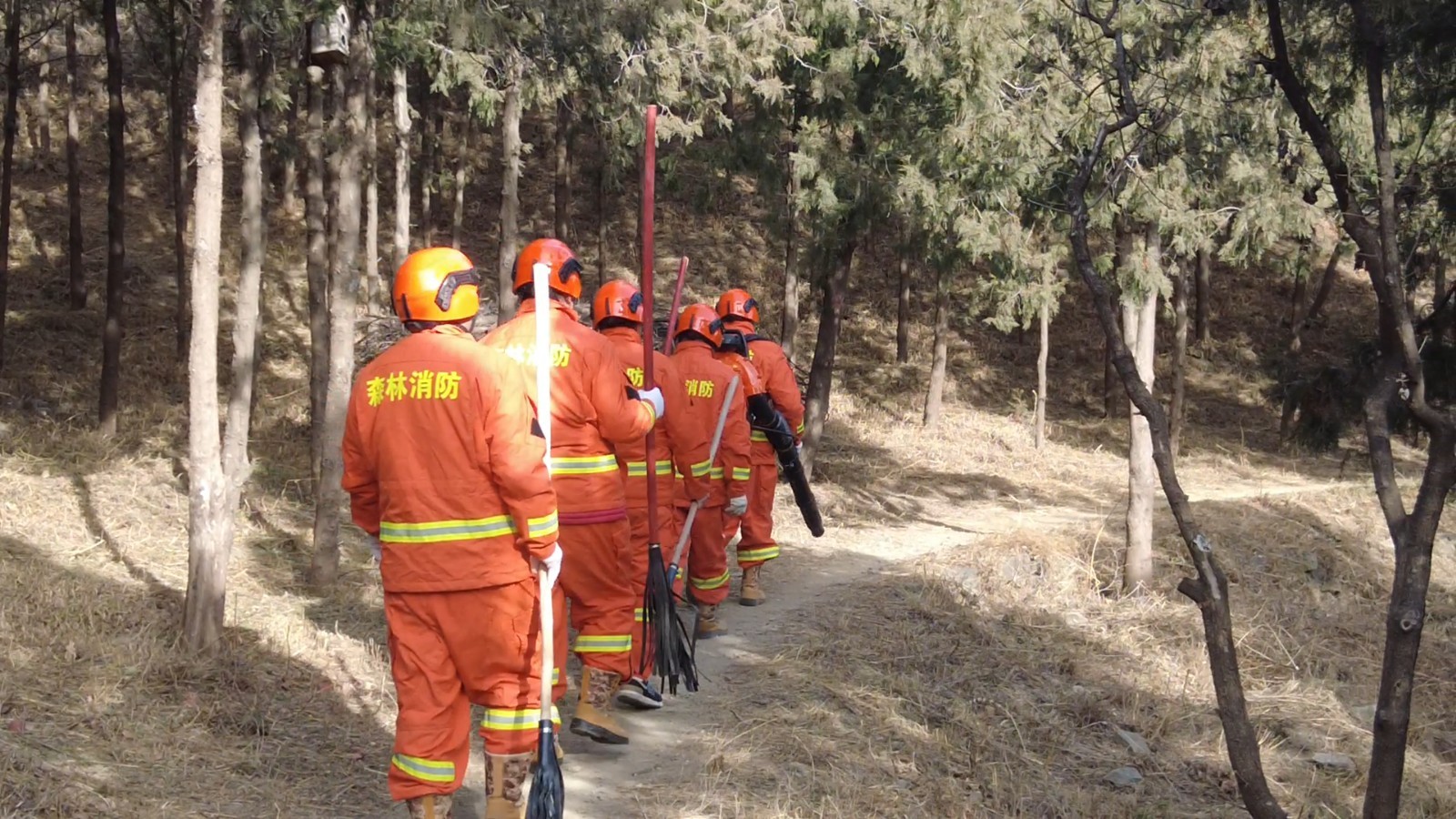在龙泉集体林场管辖地块内,队员们身着醒目的防火服,领取防火设备,按组分配巡视路线及范围。