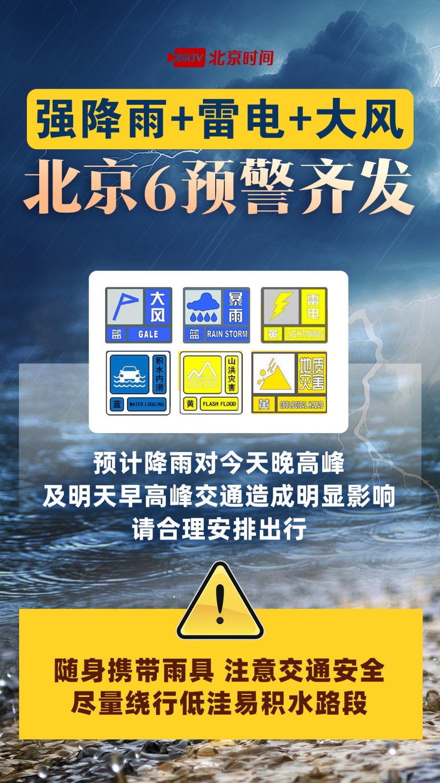 目前北京处于大风、雷电、暴雨、积水内涝、山洪灾害、地质灾害预警中,预计降雨会对今天晚高峰及明天早高峰交通造成明显影响,请合理安排出行,随身携带雨具,注意交通安全,尽量绕行低洼易积水路段。