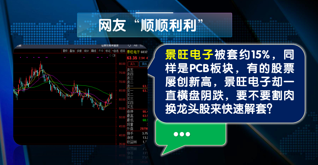 网友“顺顺利利”留言:我拿的景旺电子,被套约 15%,同样是 PCB 板块,有的股票屡创新高,景旺电子却一直横盘阴跌,要不要割肉换龙头股来快速解套?