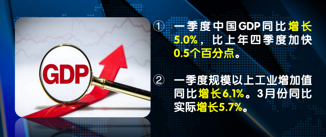 ①一季度中国GDP同比增长5.0%,比上年四季度加快0.5个百分点;