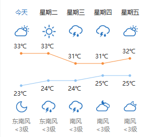 白天多云转晴,午后山区有阵雨或雷阵雨,最高气温33℃