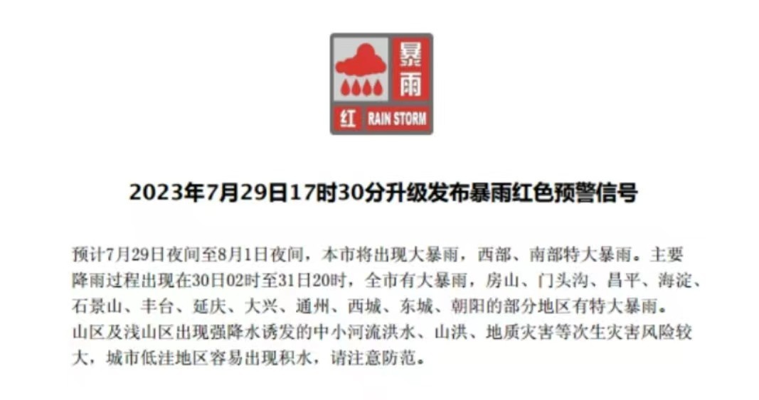 北京市气象台刚刚升级发布了暴雨红色预警。预计7月29日夜间至8月1日夜间,本市将出现大暴雨,西部、南部特大暴雨。主要降雨过程出现在30日02时至31日20时,全市有大暴雨,房山、门头沟、昌平、海淀、石景山、丰台、延庆、大兴、通州、西城、东城、朝阳的部分地区有特大暴雨。山区及浅山区出现强降水诱发的中小河流洪水、山洪、地质灾害等次生灾害风险较大,城市低洼地区容易出现积水,请注意防范。