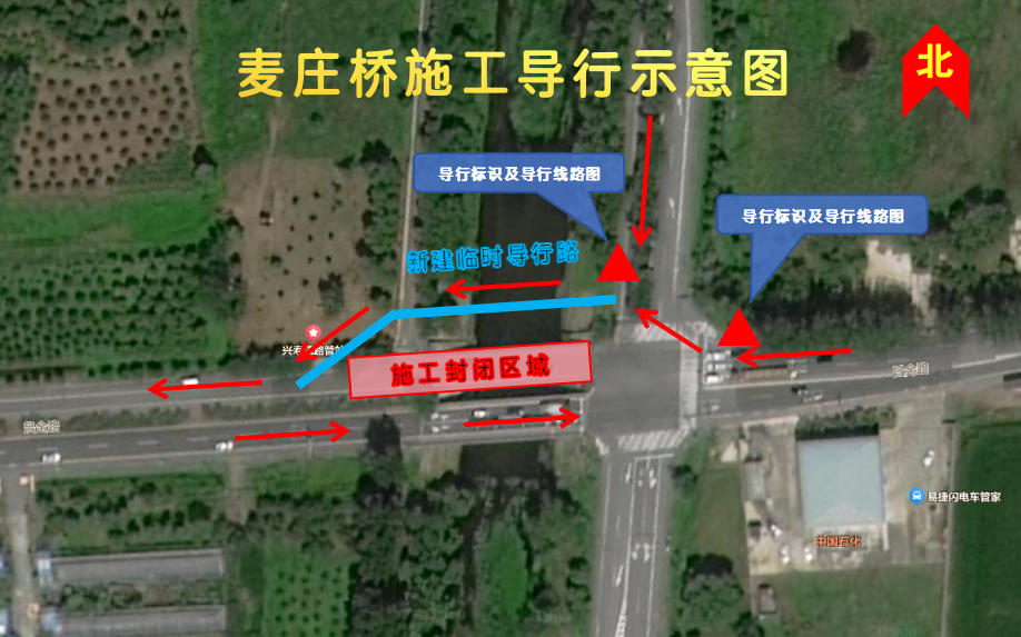 麦庄桥封闭北半幅桥面(东向西),并在北侧新建导行道路,南半幅(西向东)车辆行人照常通行。