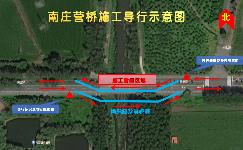 南庄营桥封闭北半幅桥面(东向西),该方向车辆改至南半幅桥面通行;在南半幅桥面的南侧新建导行路,原南半幅(西向东)车辆请移至南侧新建导行路行驶。