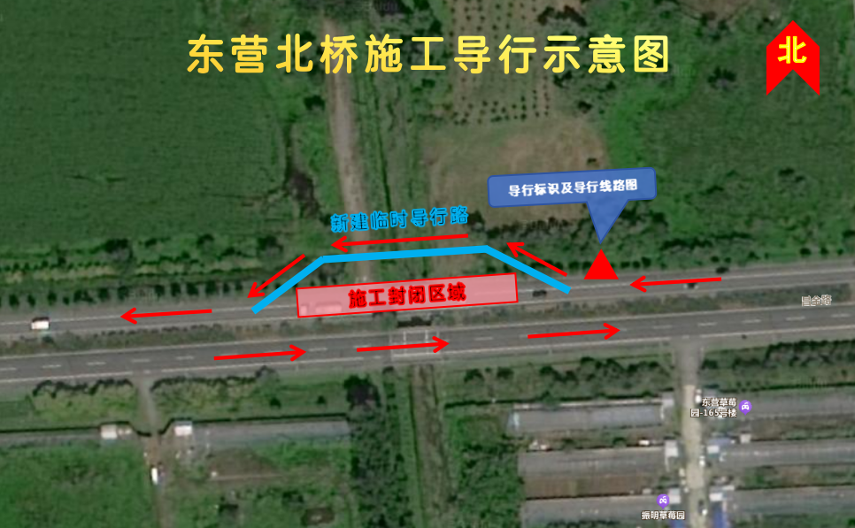 东营北桥封闭北半幅桥面(东向西),并在北侧新建导行道路,南半幅(西向东)车辆行人照常通行。