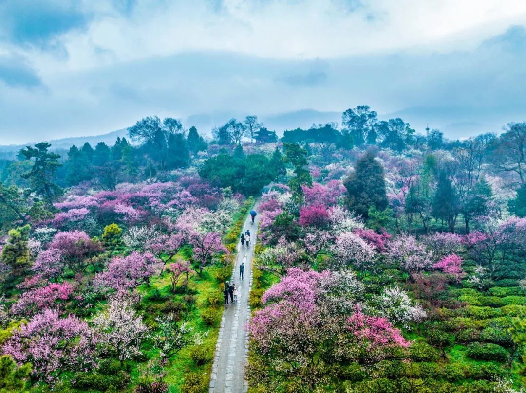 在江南地区,还有一处十分有名的赏梅胜地——杭州超山风景区。这里的梅花以“古、广、奇”三绝而名扬天下,有“十里梅花香雪海”的胜景。冬春之际,白梅、红梅遍布各处,置身高处俯瞰好似漫天飞舞的雪花,美到极致。