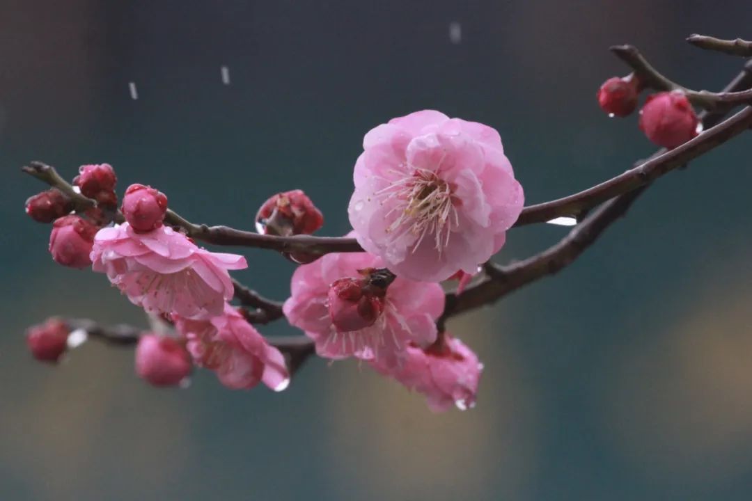 雨中梅。盛开的梅花伴着细细雨丝,显得格外清新淡雅。下雨时,可以选择树木、建筑等相对较暗的背景,快门速度越慢,拍摄出来的雨丝就越长,采用逆光或侧光,更能突出雨丝的形态和质感。