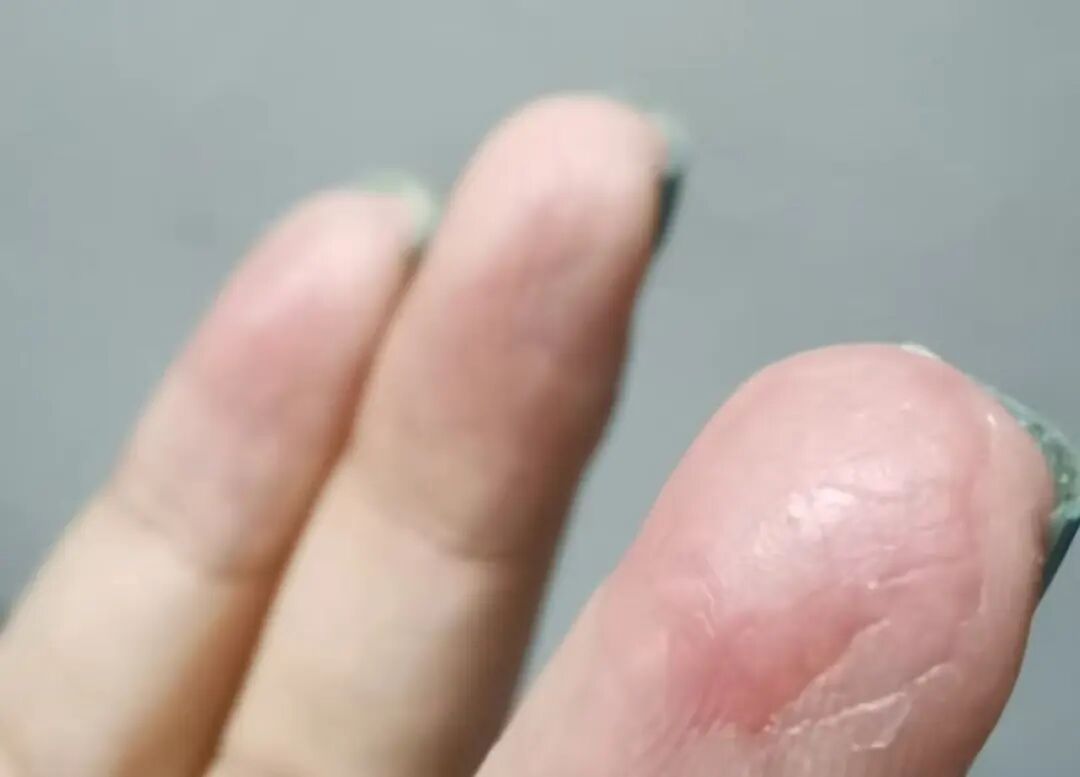 手指、掌面的褶皱处,这些原本应该自然分布着掌纹的部位,却长出了边界清晰的红斑、丘疹,甚至还有破溃、掉屑,皮肤表皮也变厚、粗糙,让一双手看起来“饱经风霜”。