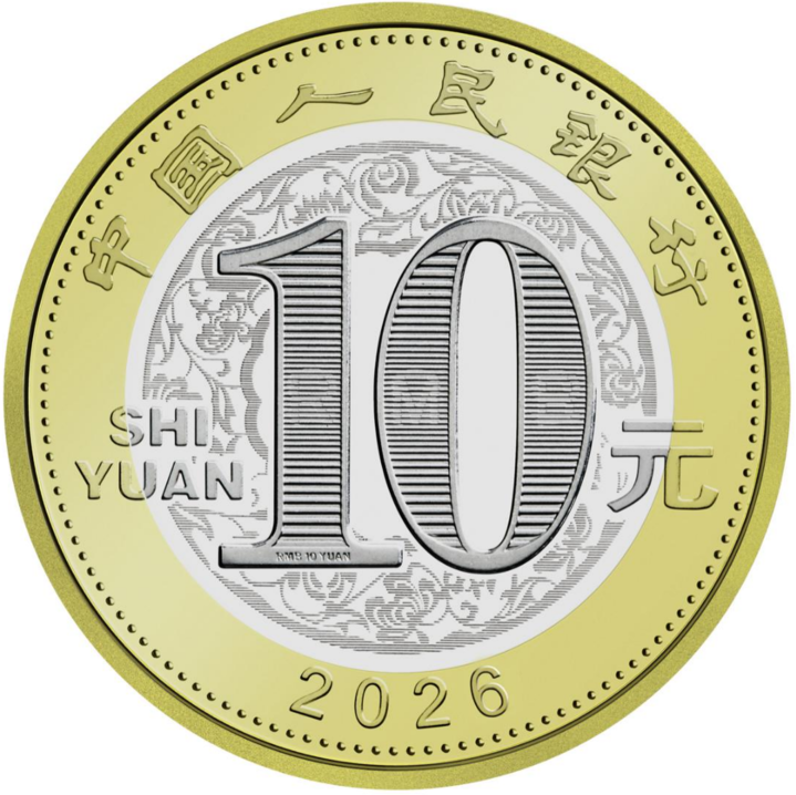 双色铜合金纪念币正面图案为“中国人民银行”“10元”字样,汉语拼音字母“SHIYUAN”及年号“2026”,底纹衬以团花图案。背面图案为中国传统剪纸艺术与装饰年画元素相结合的马形象,衬以花灯和萱草图案,币面左侧刊“丙午”字样。