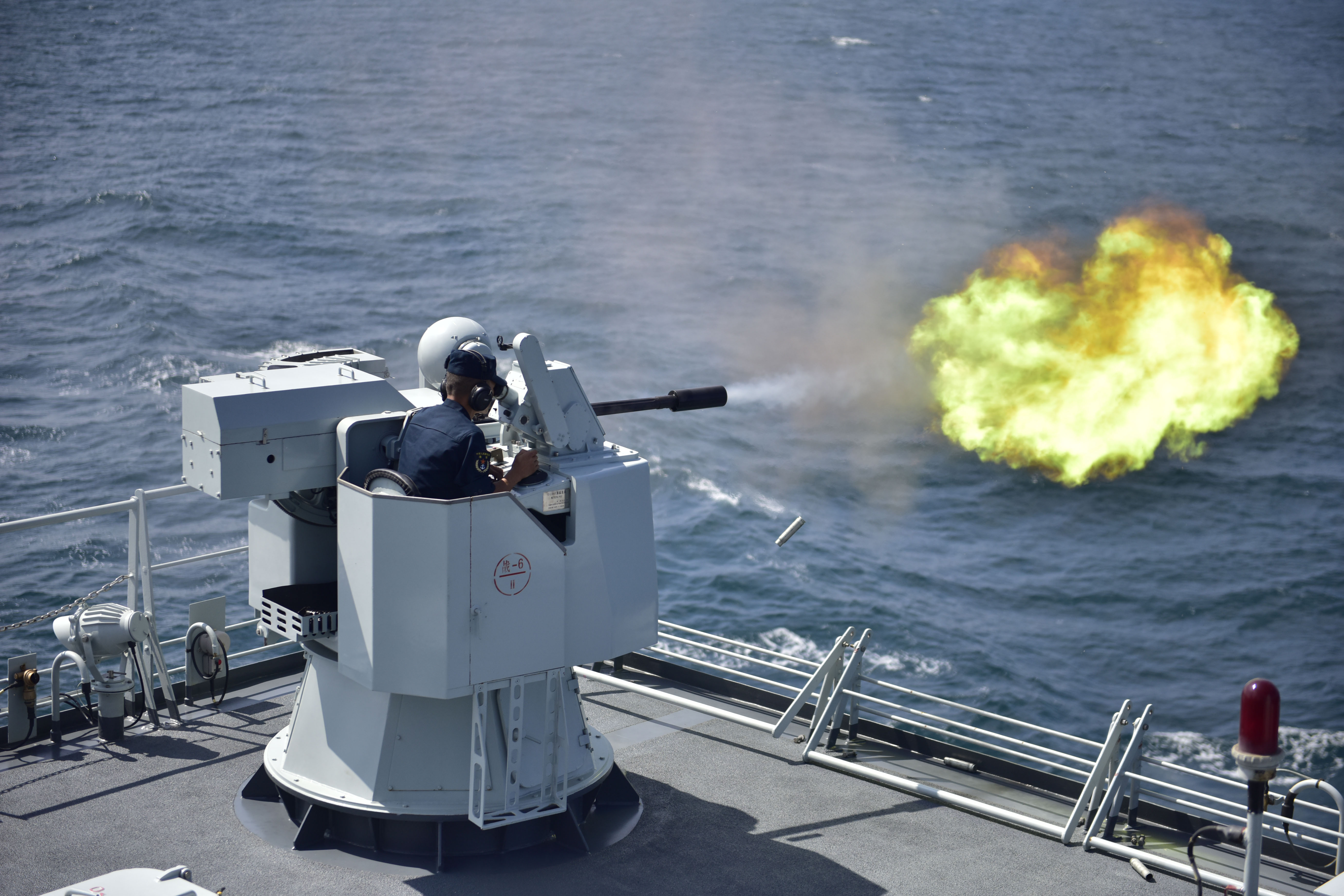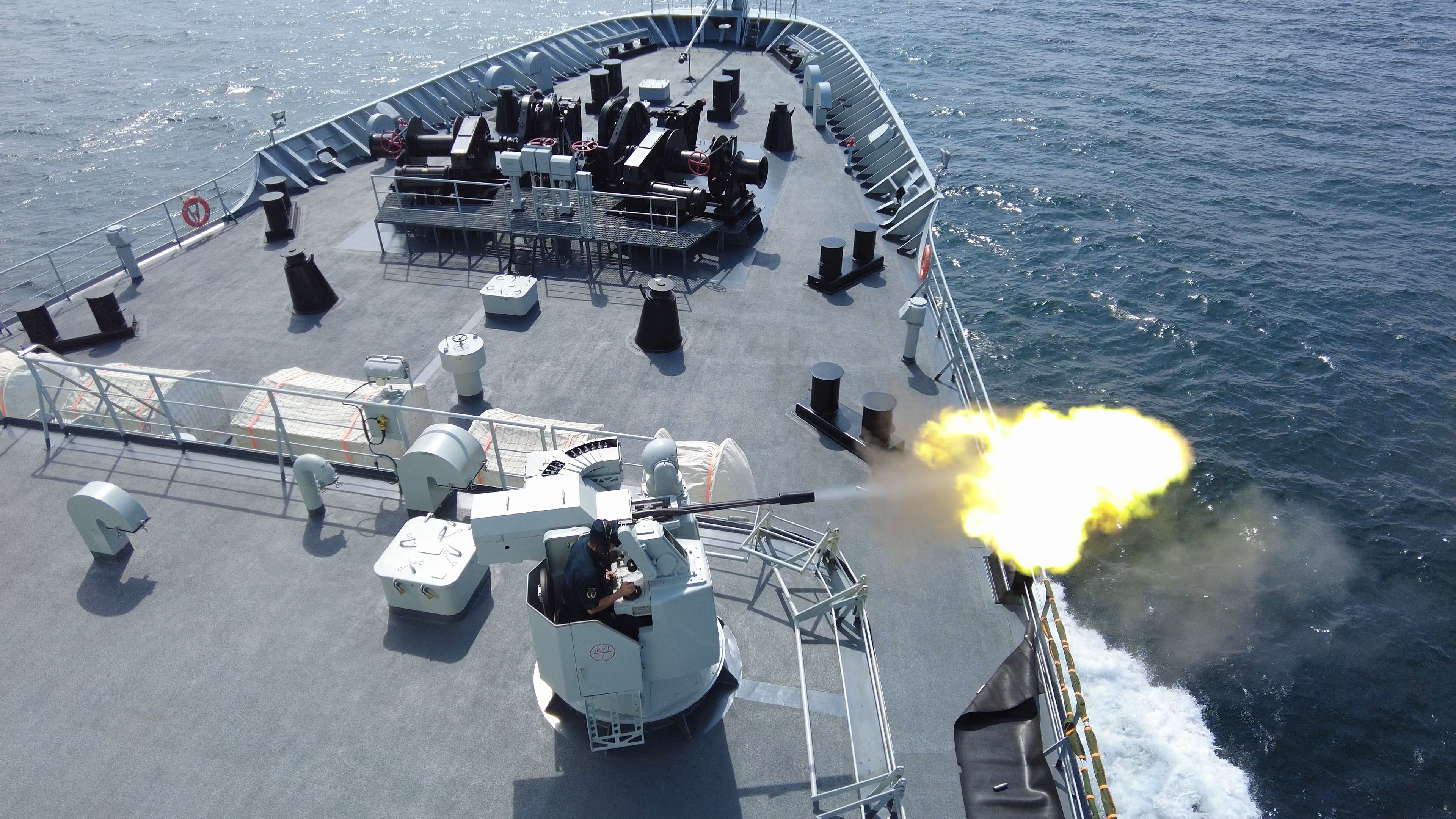 “可疑小艇依然向我抵近!”警告无效的情况下,特战分队迅即使用轻重机枪对可疑小艇实施拦阻射击。小艇仍然高速前行,向被护商船抵近。