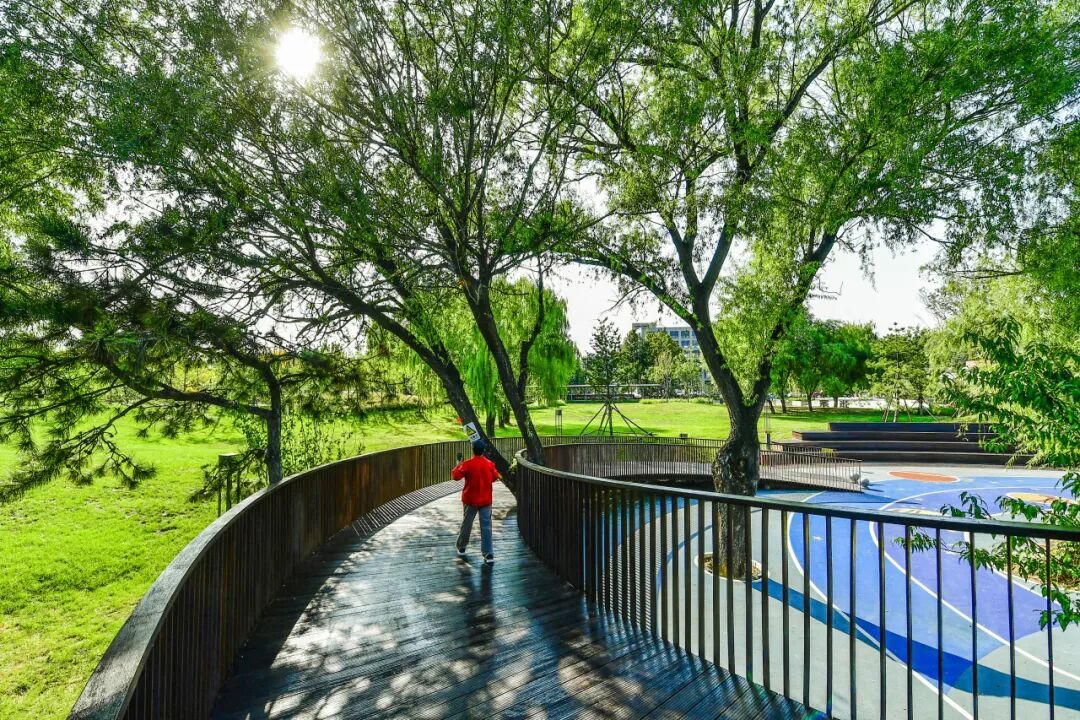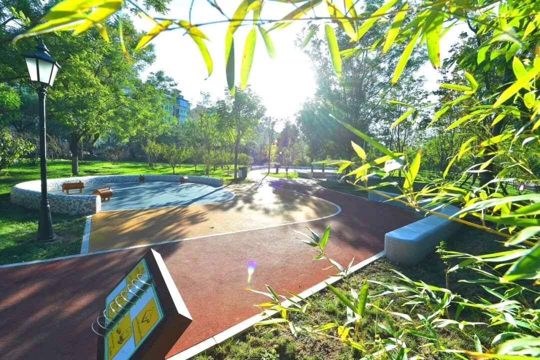 紫荆园小区就是利用了现有的座椅进行融合利用,居民逛累了能坐下聊天。悦澜家园的木皮园路宽度刚好容两人并行,推着婴儿车也能轻松通过。
