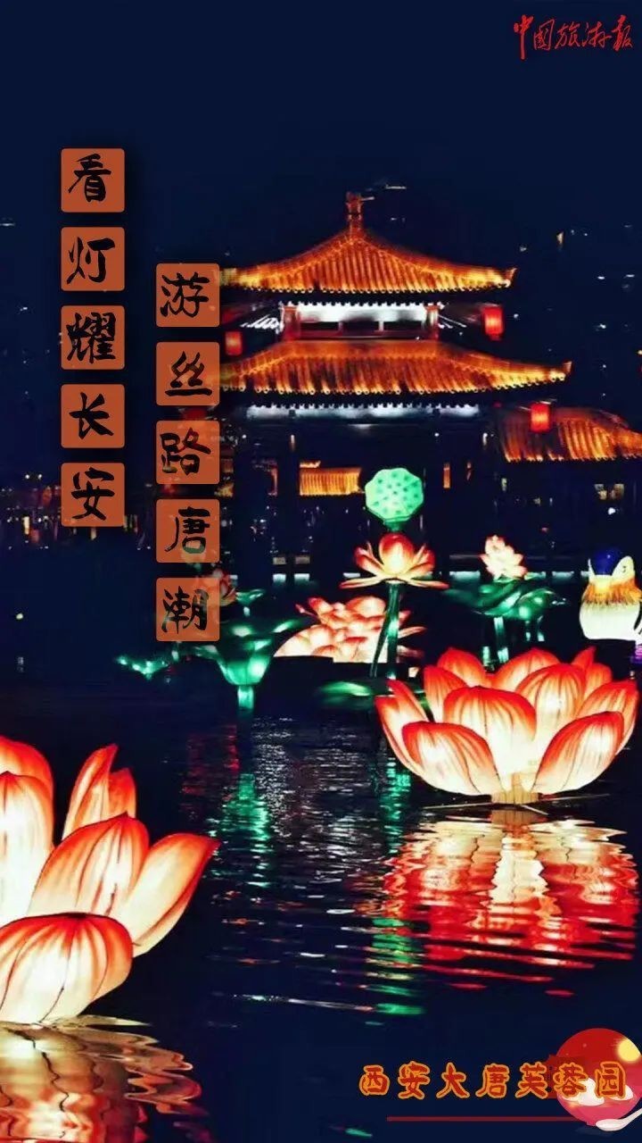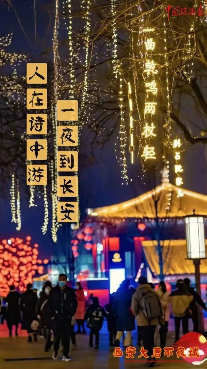 大唐不夜城“诗意长安”灯组,以树木为骨,诗词为魂,百余组唐诗灯牌如荧荧流星,袅娜悬于空中,撩动雁塔夜色,恍若梦回千年前的盛唐。