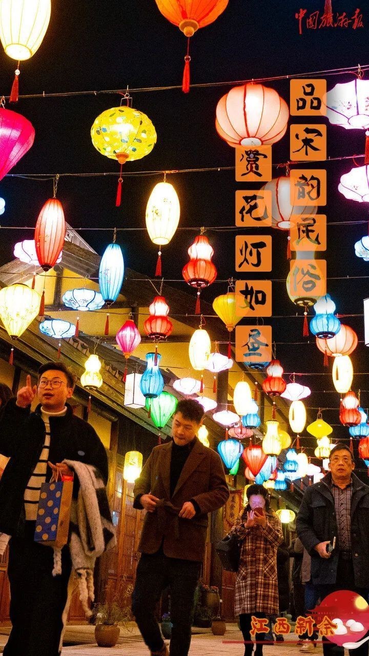 点灯笼、猜灯谜、看表演……众多游客汇聚在江西新余宽心小镇宋韵民俗主题灯会,品味丰富多彩的民俗活动,感受宋韵灯会的热闹氛围。