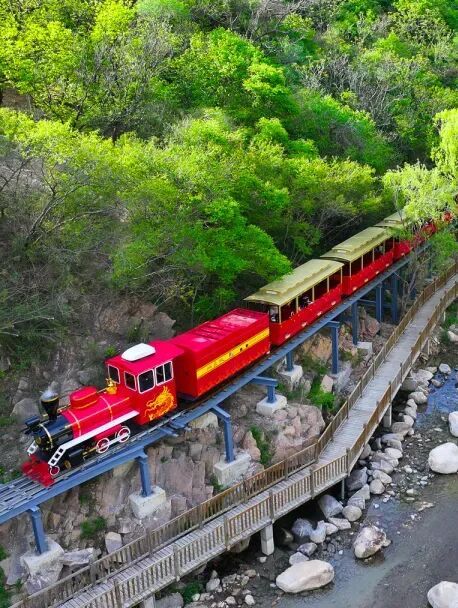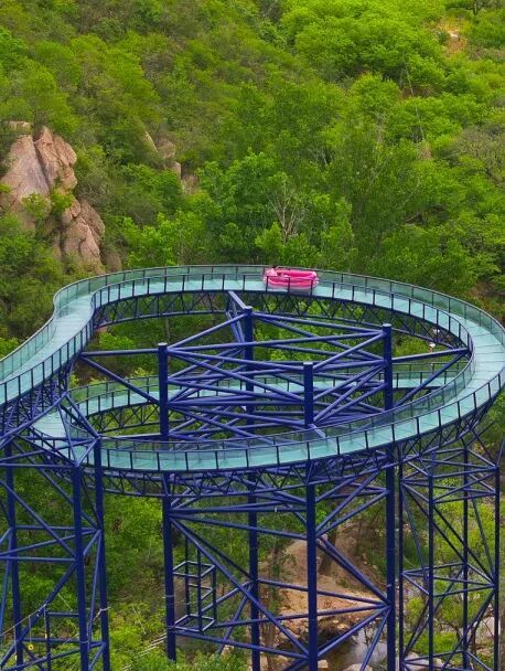 陆地与高空体验则满足了不同群体的需求。不想爬山的游客可搭乘磁滑道,5-6分钟便能直达长城顶端观景台,轨道穿梭于山涧之间,一步一景,登顶后可将五彩山峦与碧水长城的全景尽收眼底 。复古山谷小火车从沙滩出发,沿水岸穿梭林间秘境,十余分钟的旅程中,车窗里框住的尽是秋日静谧风光,终点黑龙潭更是亲子捞鱼捉虾的乐园。寻求刺激的游客则可挑战高空三项:悬崖边的超级大秋千荡起时能感受风的速度,云端漫步在凌空步道上可俯瞰山水全景,就连“窝囊版蹦极”也能让胆小者体验低空弹跳的乐趣,释放压力。全长1000多米的云顶玻璃漂流更是必打卡项目,全透明滑道沿山势而下,穿梭在彩叶林间,清凉水花与高空视野带来双重刺激。