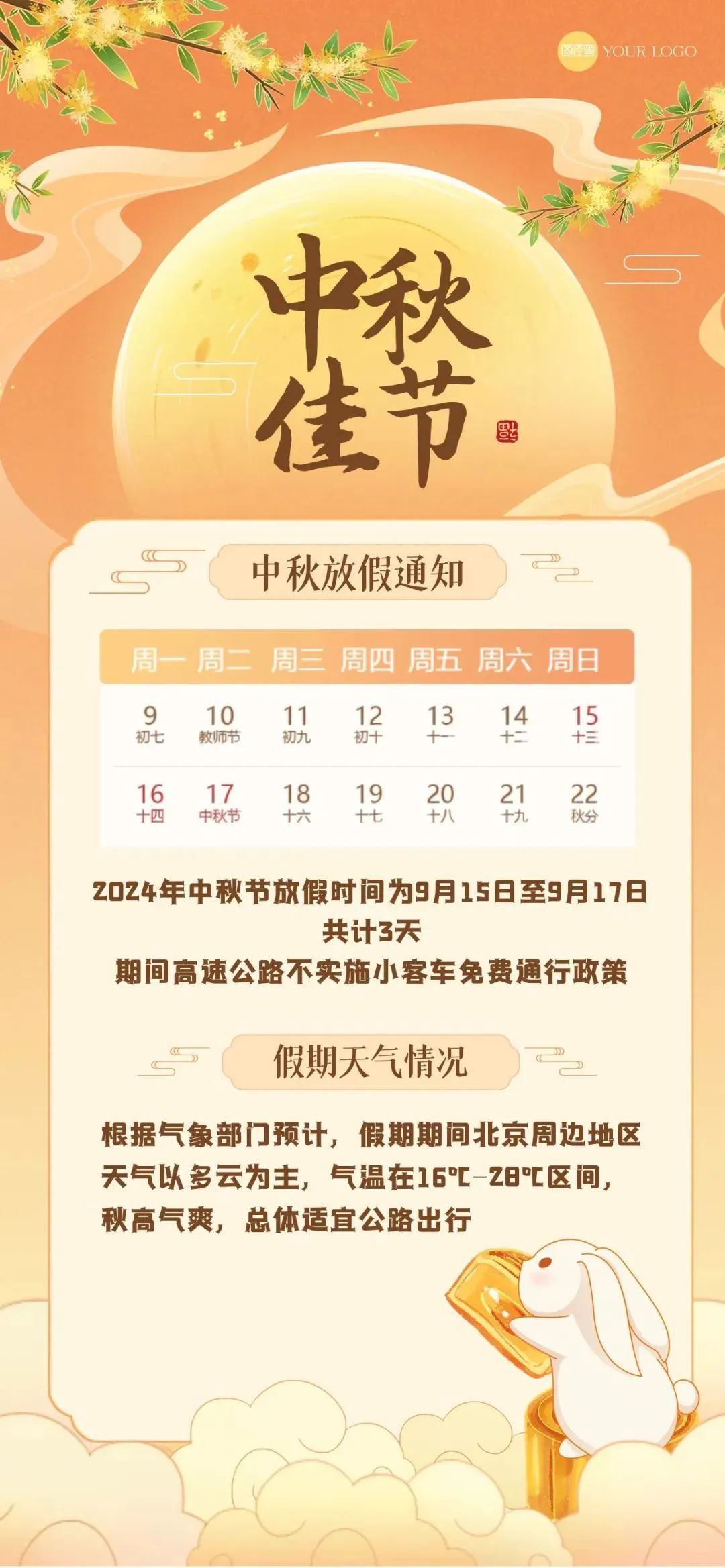 2024年中秋节放假时间为9月15日至9月17日,共计3天,期间高速公路不实施小客车免费通行政策。