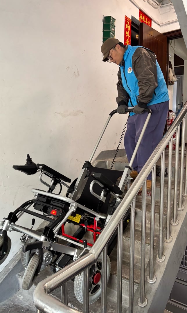 老人的家,位于驿站附近一栋居民楼的二层,属于老旧小区,楼内没有电梯。进入单元门后,赵师傅转了个圈儿,倒退着上了几级台阶,将机器倾斜约30度,并按下手柄上的按钮。“嗡嗡”声中,原本竖立在座椅后的两条履带“搭”在台阶上,如坦克行进般转动起来,将整部机器稳稳运至楼上。
