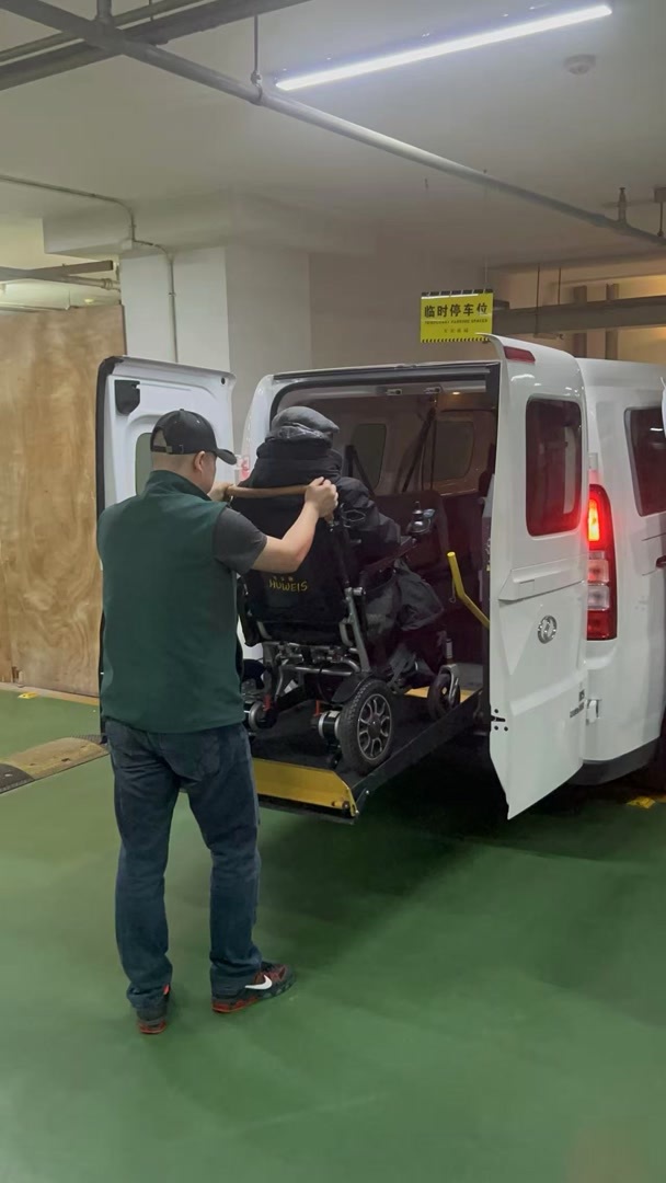 周五正好是邓爷爷又一次医院复查的日子,和之前一样,这次也是家里人预约的无障碍车。上午9点钟,无障碍车已经停在了小区车库等待,这是一辆六座的轻型客车,打开车后门,里边有宽敞的空间可以容纳轮椅。司机师傅把车后部的升降平台“福祉机”放下来,把邓爷爷连人带轮椅推到平台上之后,缓缓把平台升到和车身同高,随后再把老人慢慢推进车。之后,师傅把轮椅的刹车踩住,给老人系好安全带,把轮椅也用车上的固定带固定住,随后就可以驾车出发了。