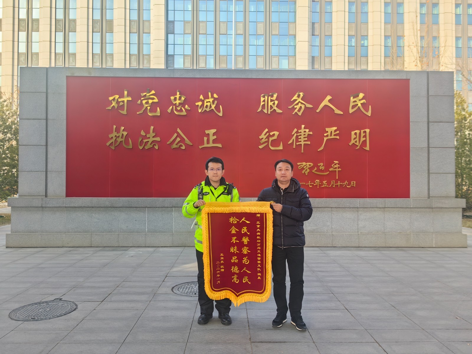 近日,旅客王先生专程将一面印有“人民警察为人民,拾金不昧品德高”的锦旗送到支队,感谢民警高效找回遗失手机,避免财产损失与航班延误。