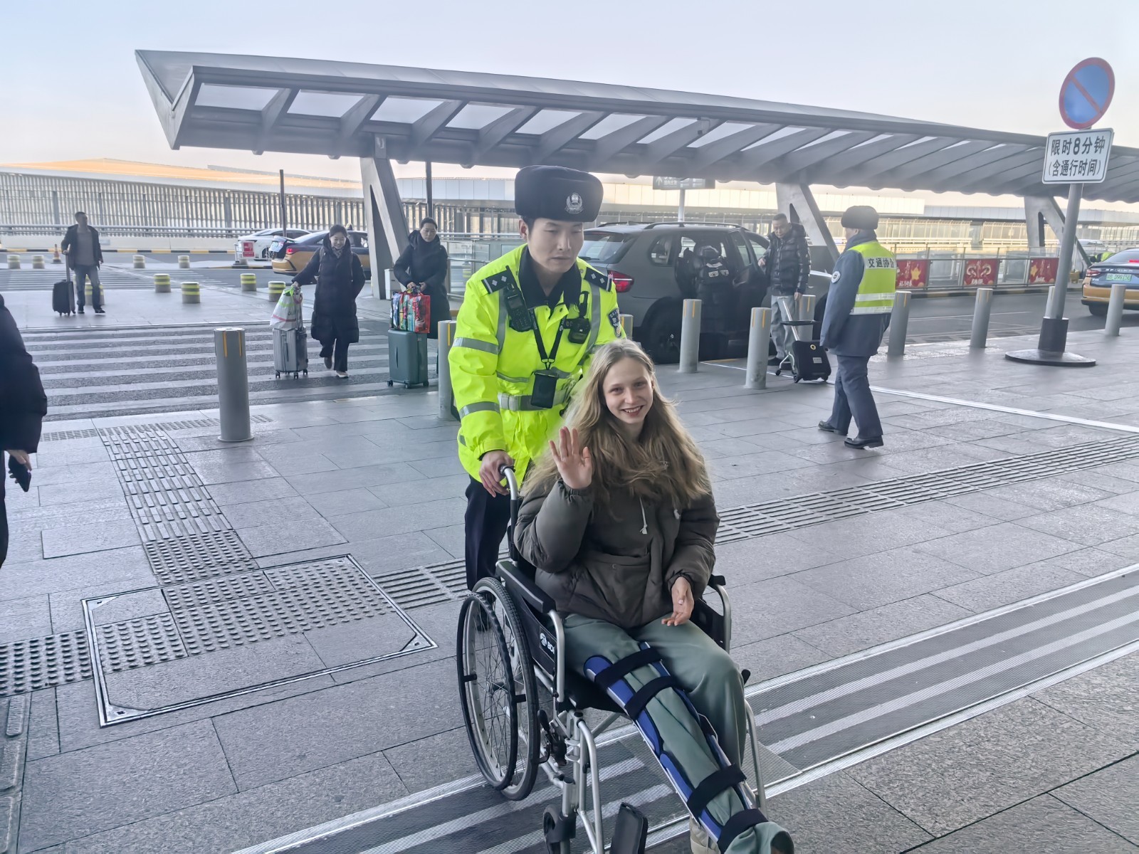 民警立即安抚旅客情绪,协调机场工作人员借来轮椅,小心安置受伤旅客;主动帮忙搬运行李,全程护送进入航站楼、引导至值机柜台,协助完成值机与行李托运,确保顺利成行。临别时,外籍夫妇连连致谢,用生硬的中文说“谢谢”,对民警的热心与专业高度评价。