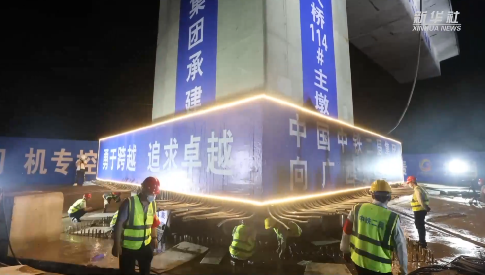 南玉铁路跨黎湛铁路特大桥转体梁重5810吨,长99米,是全线最长的双线转体桥。5月24日凌晨3:40,随着现场总指挥一声令下,在灯火通明的夜空中,跨黎湛铁路特大桥转体梁沿逆时针方向开始缓缓转动。4时48分,转体梁顺利完成57°转体。