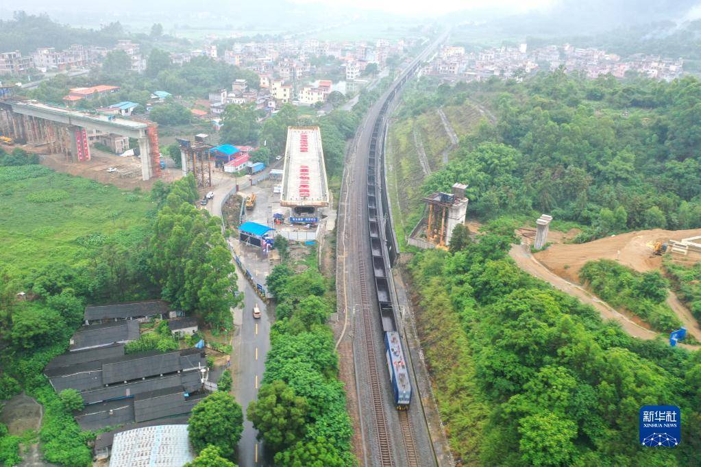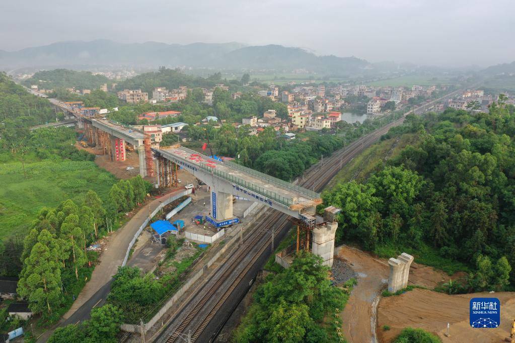 5月23日拍摄的转体前的南玉高铁跨黎湛铁路特大桥转体梁(无人机照片)。