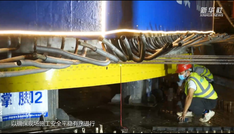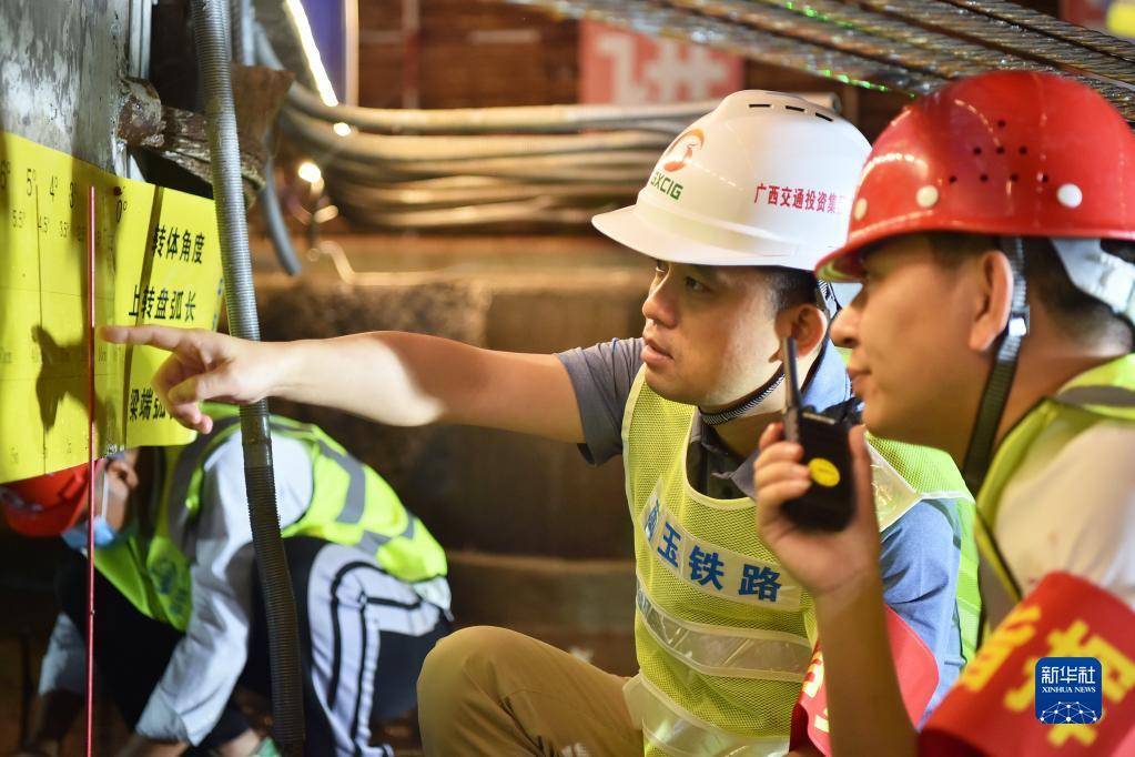 5月24日凌晨,在位于广西兴业县的南玉高铁跨黎湛铁路特大桥转体现场,技术人员在查看转体梁转角位移数据。