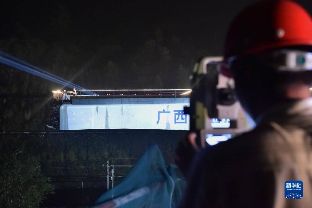 5月24日凌晨,在位于广西兴业县的南玉高铁跨黎湛铁路特大桥转体现场,技术人员对转体梁转角位移数据进行实时采集。