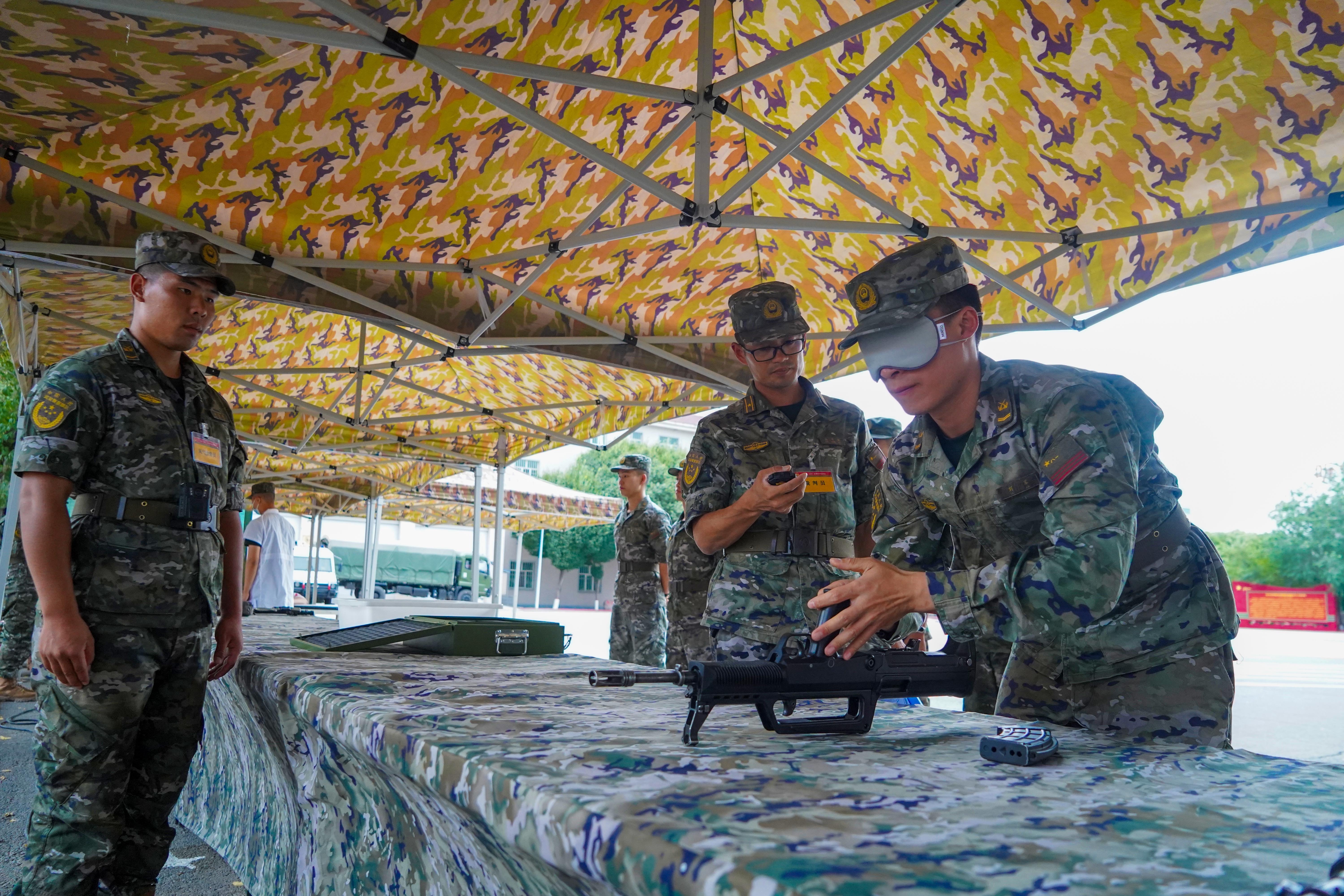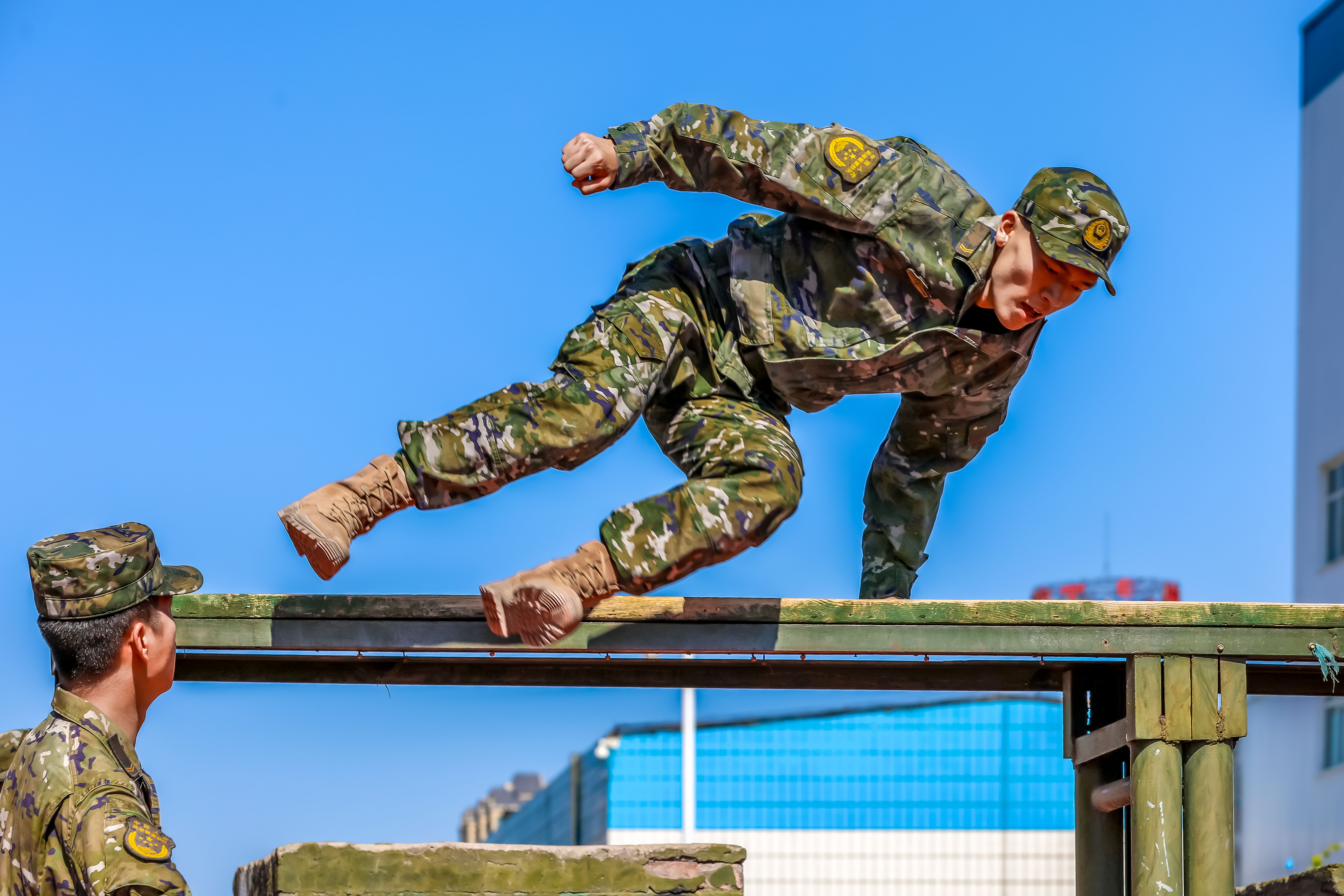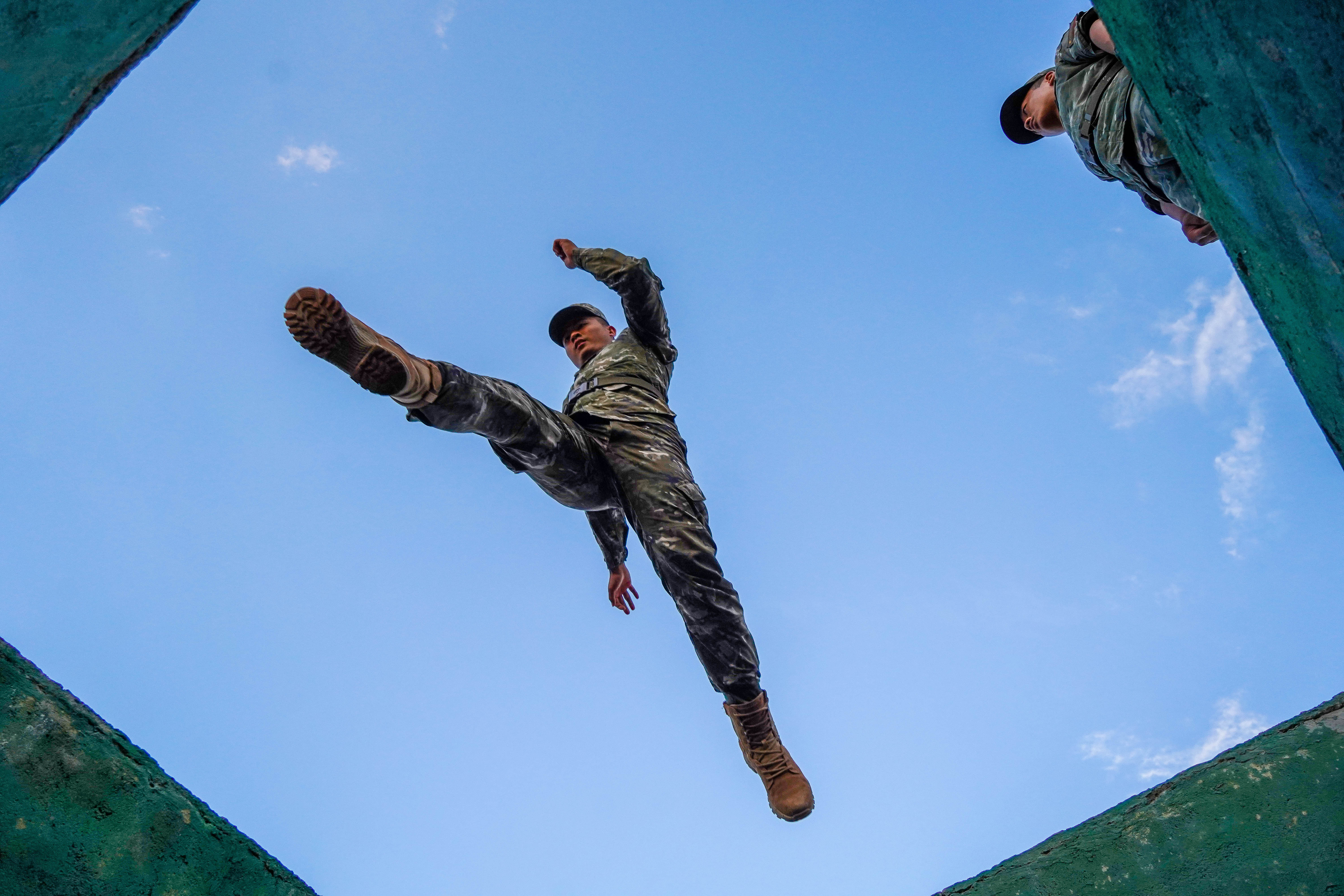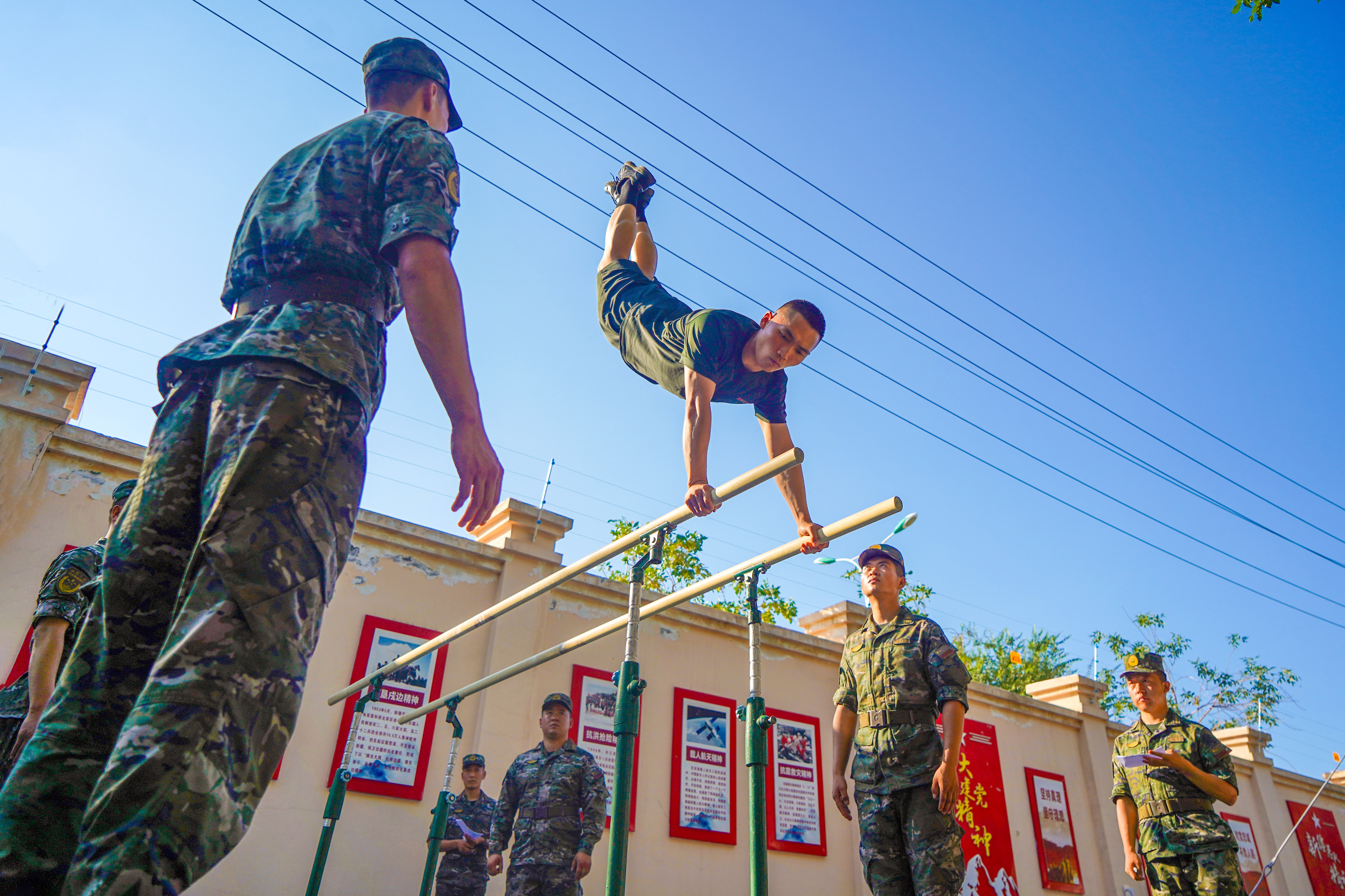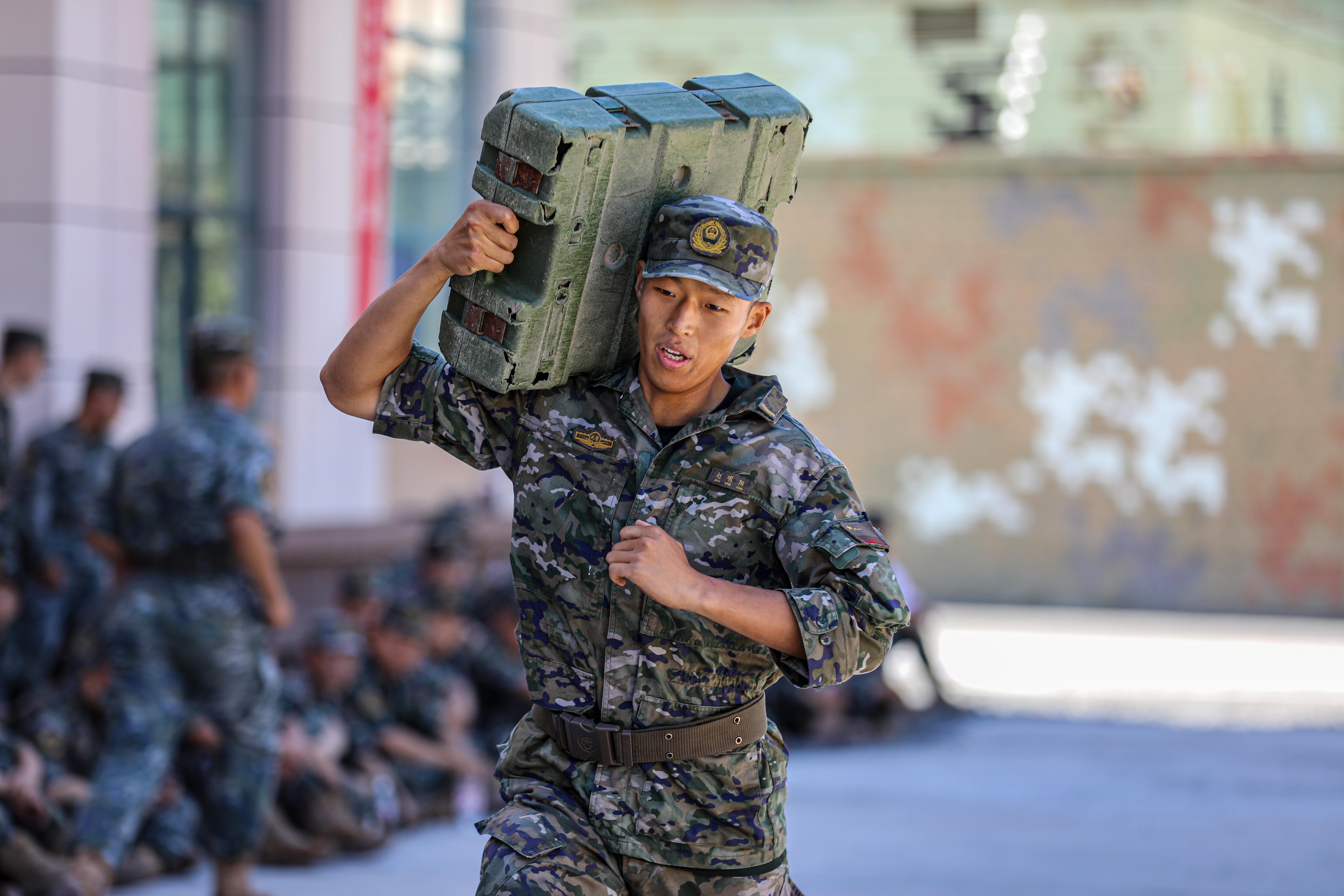 “81、82!”伴随这战友的呐喊声,在单杠引体向上课目中,中士周煌品拼尽全力,双臂青筋暴起,但他仍目光坚毅、坚持不懈,最终以83次的成绩打破该课目记录。