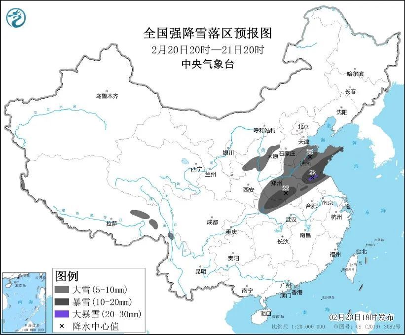 中央气象台20日18时继续发布暴雪黄色预警:预计20日20时至21日20时,山东、河南、安徽北部、江苏北部、湖北西部、河北南部、山西中南部、陕西北部、西藏西南部和东部等地部分地区有大到暴雪,其中,山东西北部和南部、河南南部等地局地有大暴雪。上述部分地区新增积雪深度3~8厘米,局地可达12厘米以上。