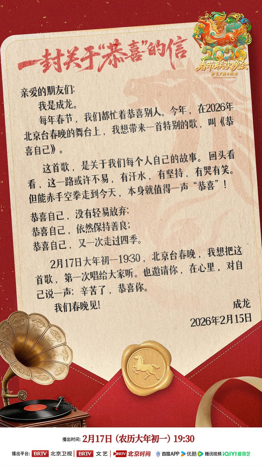 2026年北京广播电视台春节联欢晚会将于2月17日(农历大年初一)19:30,在北京卫视、北京文艺频道、北京时间客户端等平台同步播出,一同锁定这支诚意满满的贺岁短片,在成龙与群星的歌声里,给自己一个拥抱,道一声“恭喜自己”。愿我们都能带着这份肯定,奔赴“春风得意马蹄吉”的马年新春,爱你老己,继续前行。