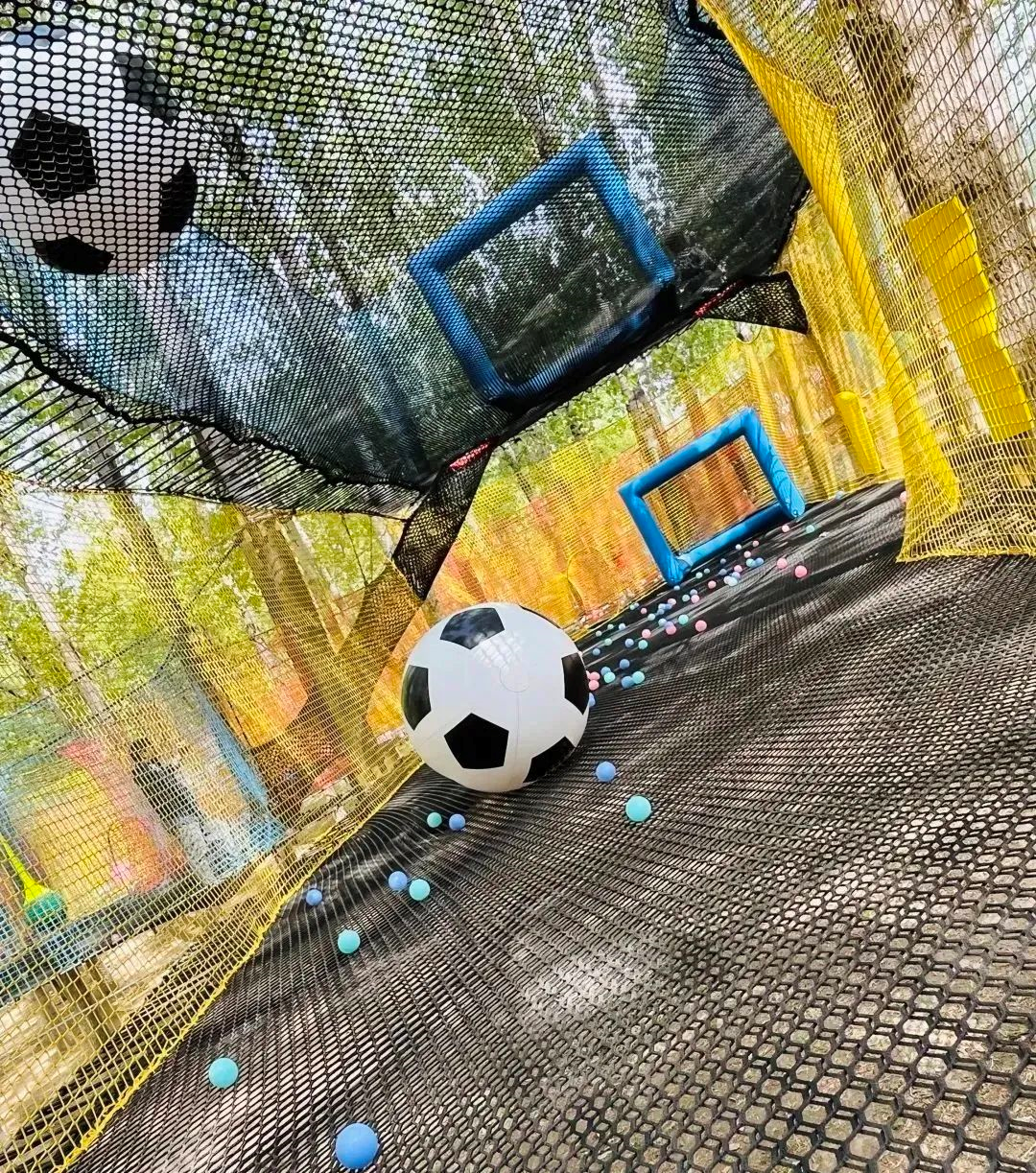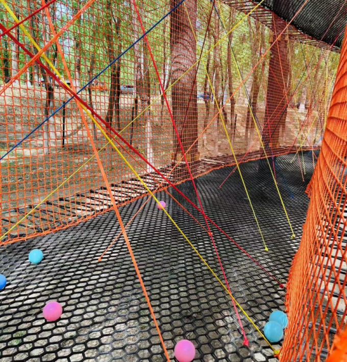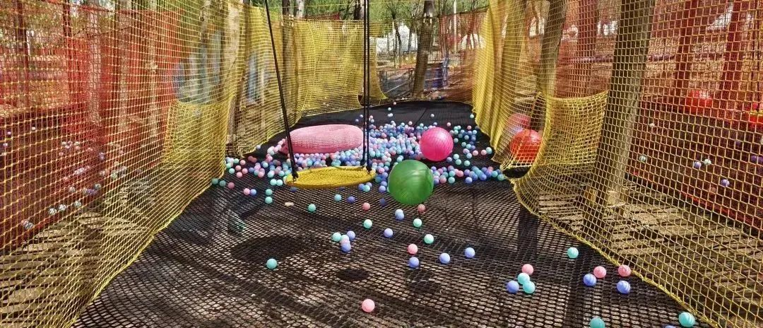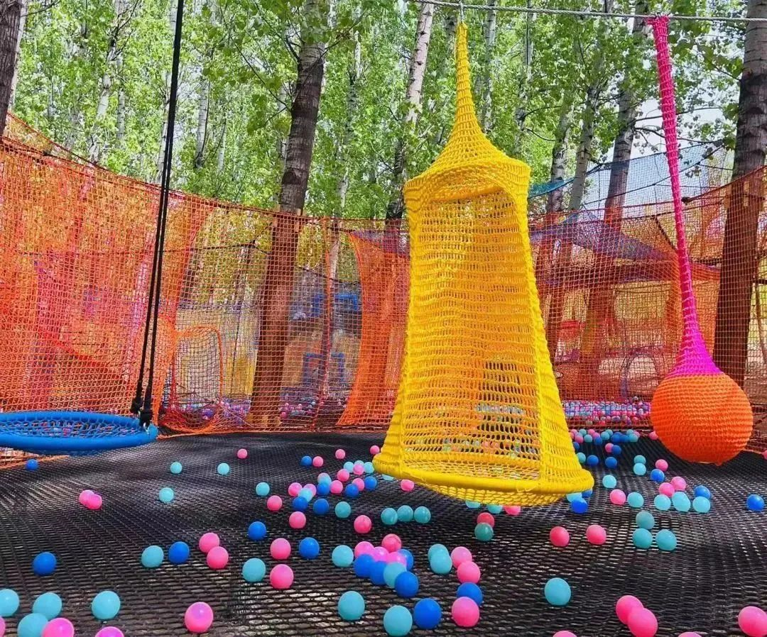 网绳露营乐园内,无动力游乐设施,可供儿童完成一系列穿越障碍环节,体验真实的自然环境,感受慢下来的游玩体验,孩子们在树林之间你来我往,每通过一个“风险口”,就向勇者迈进一步,加强孩子肢体动感能力、感官思维能力、团结协作能力和沟通交际能力!