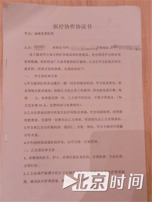 肖医生具备口腔科的相关从业资质,因此,在与该院负责人详细沟通后,她便从口腔医院辞职,并于2013年3月,与该院签署期限为5年的合作协议。