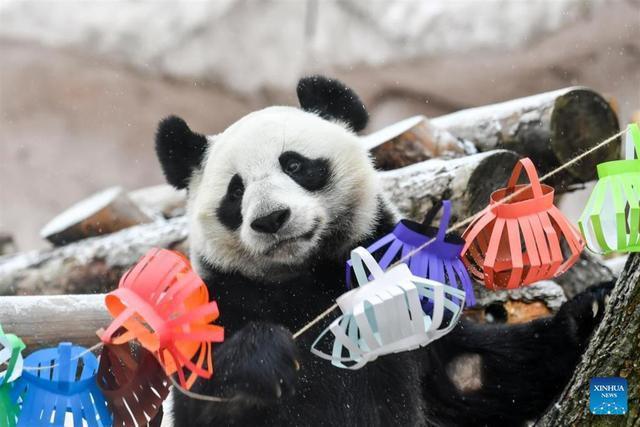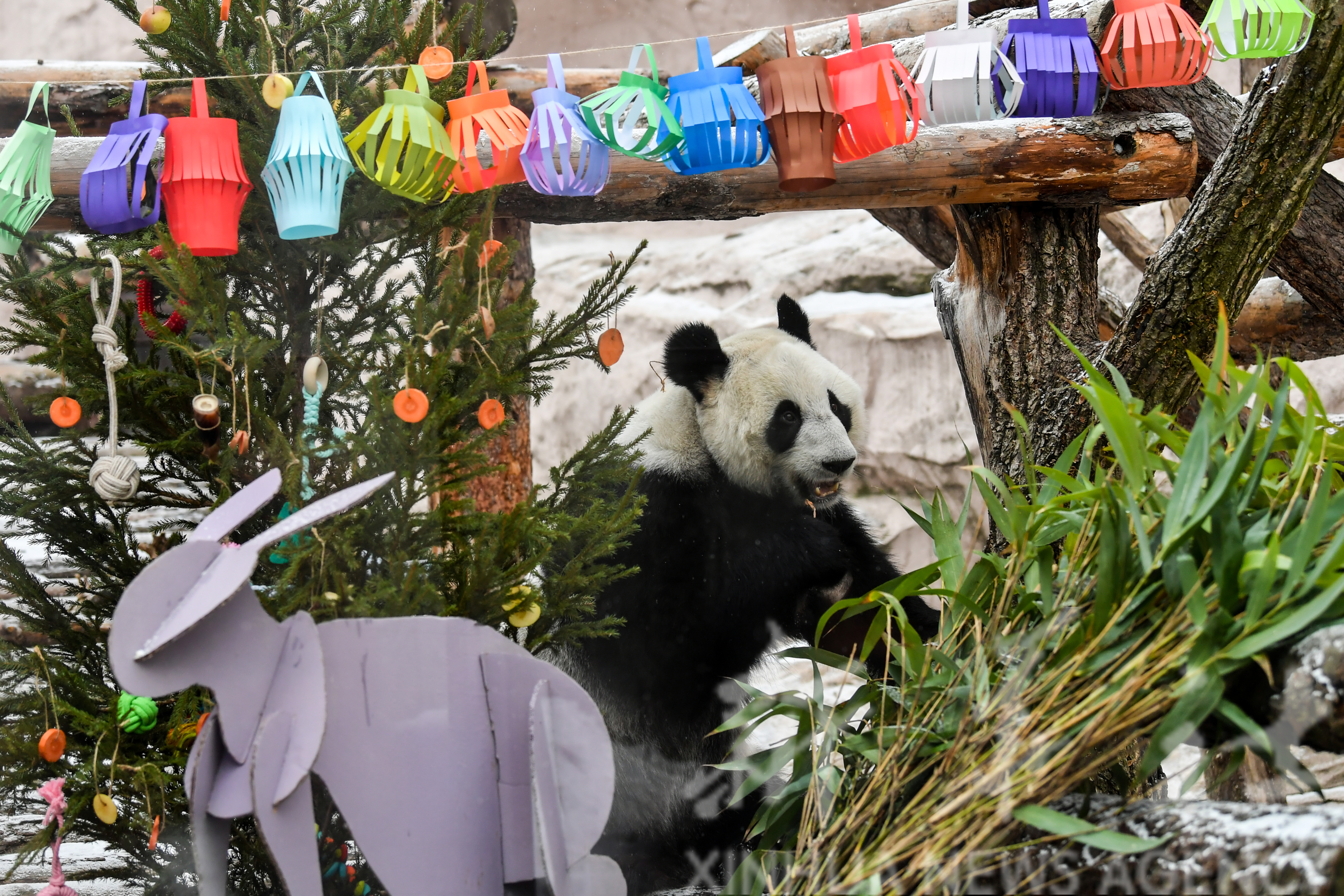 ▲2023年1月23日,莫斯科动物园为大熊猫“如意”和“丁丁”准备了新春装饰和大餐,庆祝中国春节。(新华社)