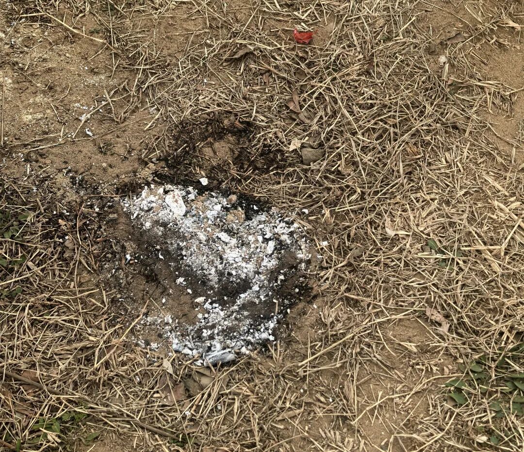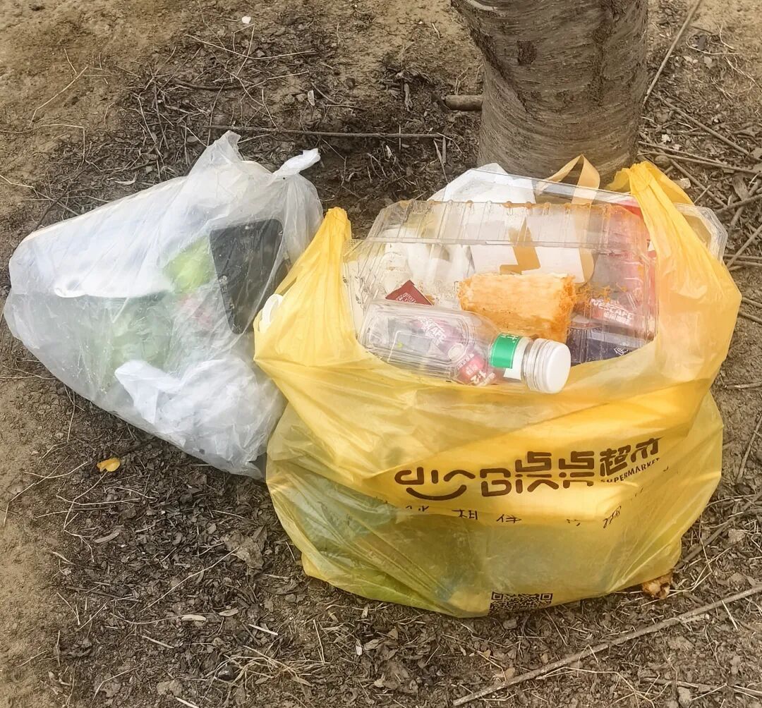 一番吃喝玩乐之后,露营者陆续离场,却没能都把垃圾带走。装有餐盒、饮料瓶和食物残渣的袋子敞口堆放在树底下。被丢弃的烧烤炉随意搭在废纸箱上,还有部分炭灰散落在干草中。