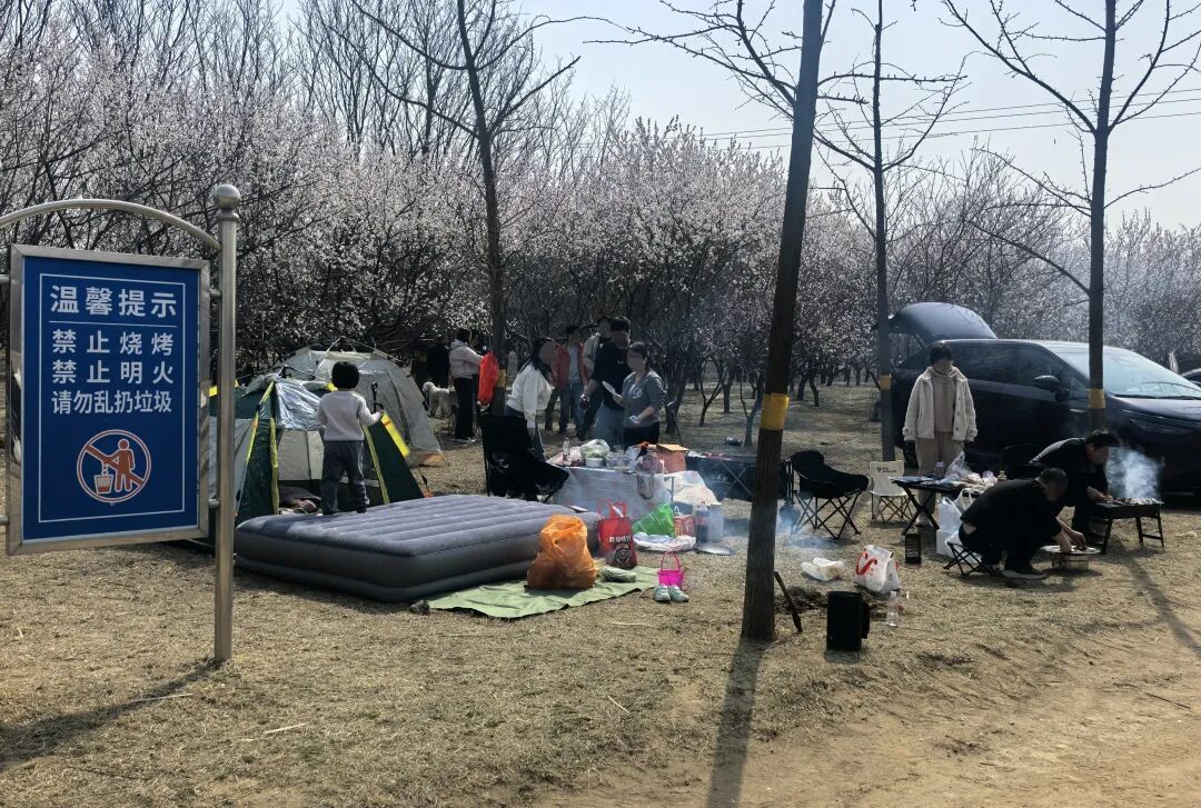 面朝小清河、背靠桃花林的位置格外抢手。一块醒目的警示牌上,明确告知“禁止烧烤、禁止明火、请勿乱扔垃圾”,但牌子两边,一个个烧烤炉很快支起来了。大大小小的帐篷外,炭火烧得正旺,肉串嗞啦作响,浓烟四处飘散。