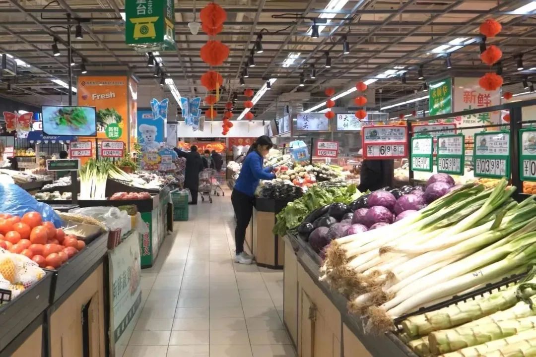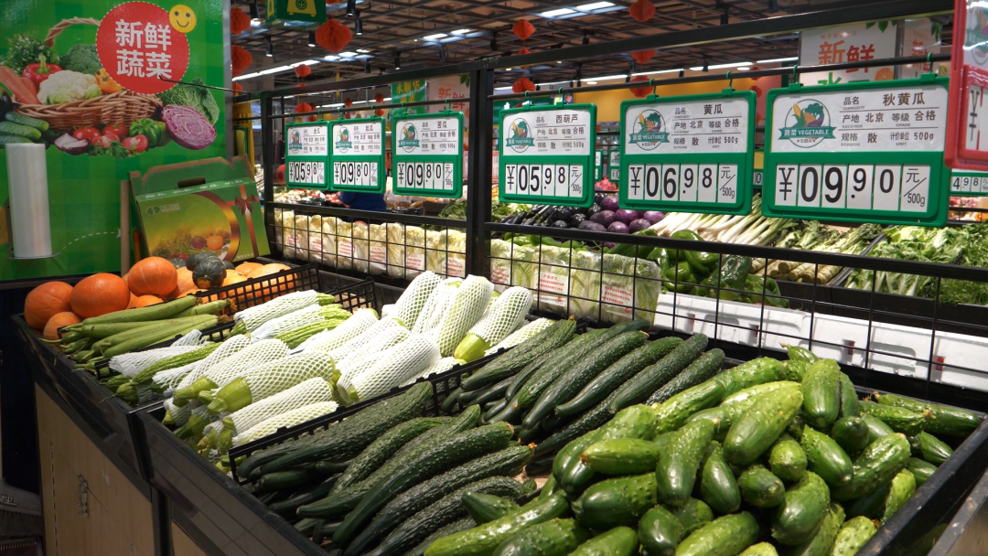 记者在该超市看到,货架上蔬菜、米面油、水果、肉蛋奶等货品齐全、种类丰富、明码标价。超市仓库备货充足,可满足顾客购物需求,随卖随补。“货物很齐全,像白菜、肉的价格都比较平稳,没有什么大波动,比较实惠。”正在选购蔬菜的市民陈先生告诉记者。