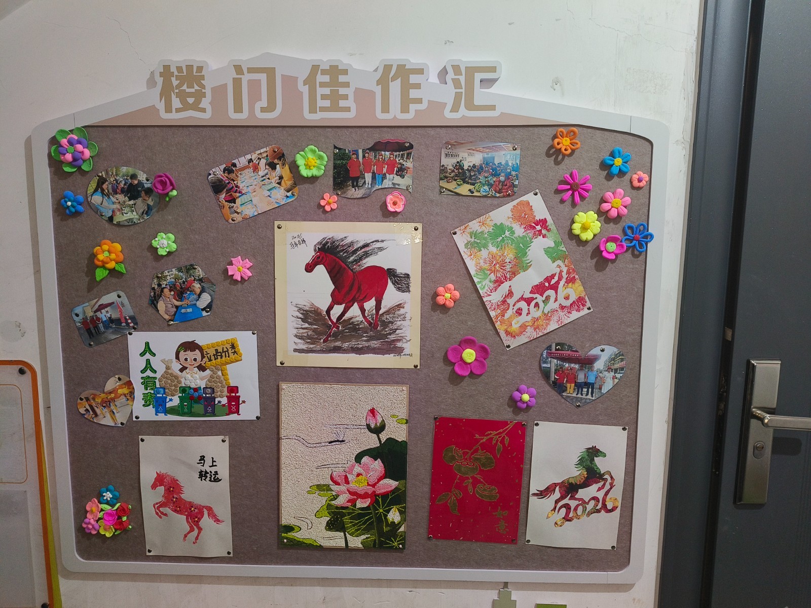 非遗纸浆画、事事如意金箔画、垃圾分类纽扣画等众多手工作品和绘画作品在楼门长和银发居民、学龄小朋友们组成的“楼门美化队伍”的通力协作下,纷纷涌现出来,整个楼门瞬间活泼起来。这些作品不仅美化了环境,更承载着深厚的文化内涵。一幅幅骏马疾风图、骏马拓印画,一件件非遗纸浆作品、金箔画、纽扣画,和一朵朵彩泥花朵手工艺品,在装点环境的同时也传播了文明理念,形成了楼门内人人参与打造的“楼门美术馆”。