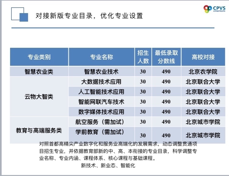 昌平职业学校是一所隶属于昌平区教委的中职学校,今年学校贯通项目做了优化调整,新增7个专业,分别与三所本科高校进行贯通培养。包括:与北京城市学院联合培养航空服务专业和学前教育专业;与北京农学院合作的智慧农业技术专业;与北京联合大学合作的大数据技术、人工智能技术、智能网联汽车技术以及数字媒体技术4个专业。