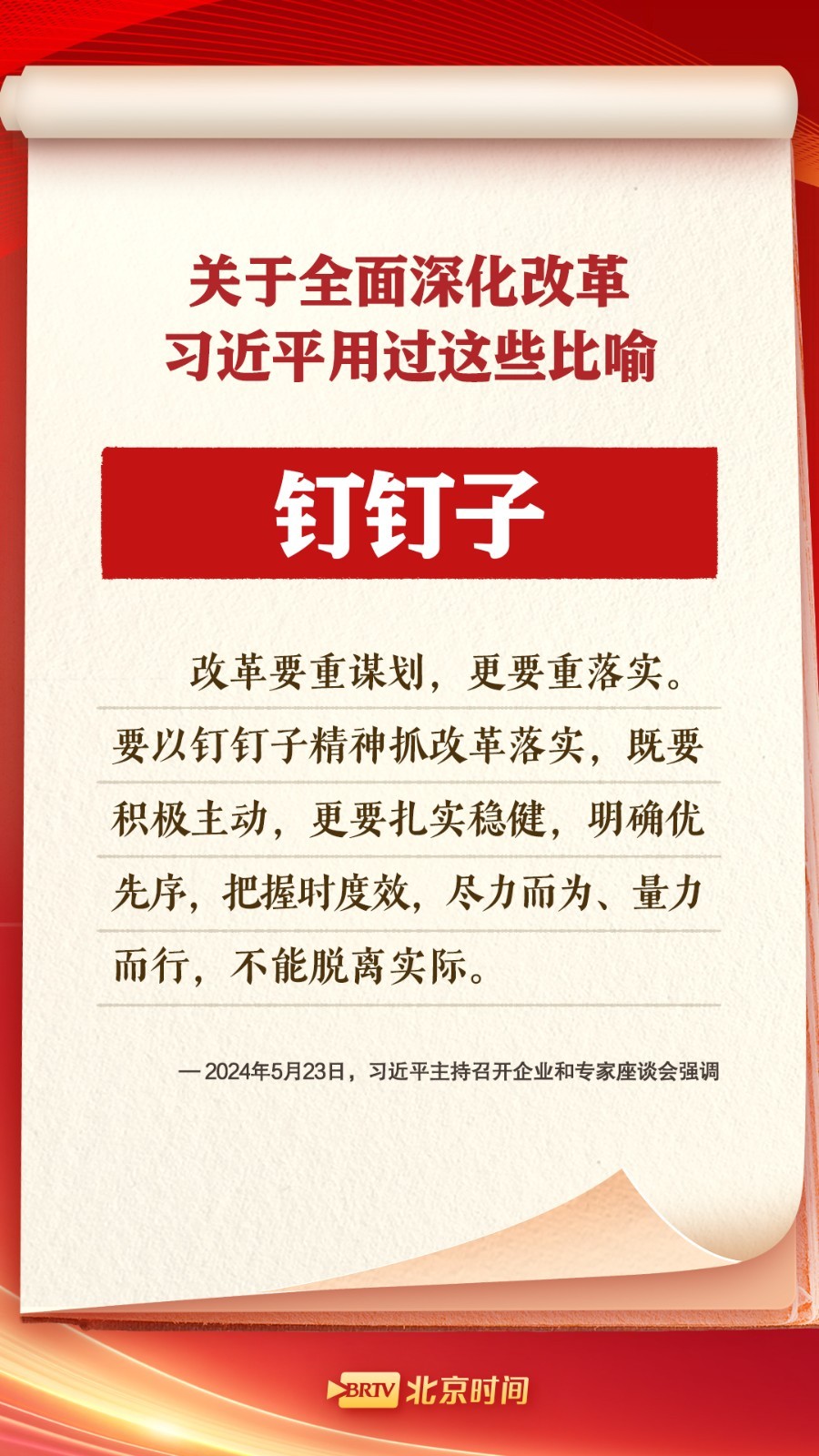 党的二十届三中全会将于7月15日至18日在京召开,本届三中全会将重点研究进一步全面深化改革、推进中国式现代化问题。“钉钉子“精神、政府“有形之手”和市场“无形之手”、做改革的“弄潮儿”……关于全面深化改革,习总书记用过的这些比喻生动形象。快快收藏,一起学习!